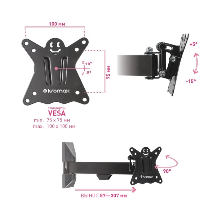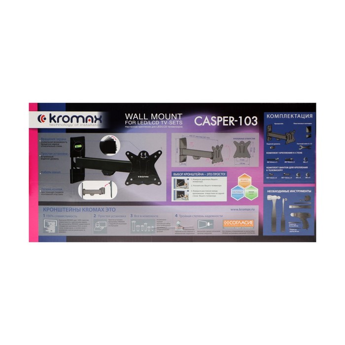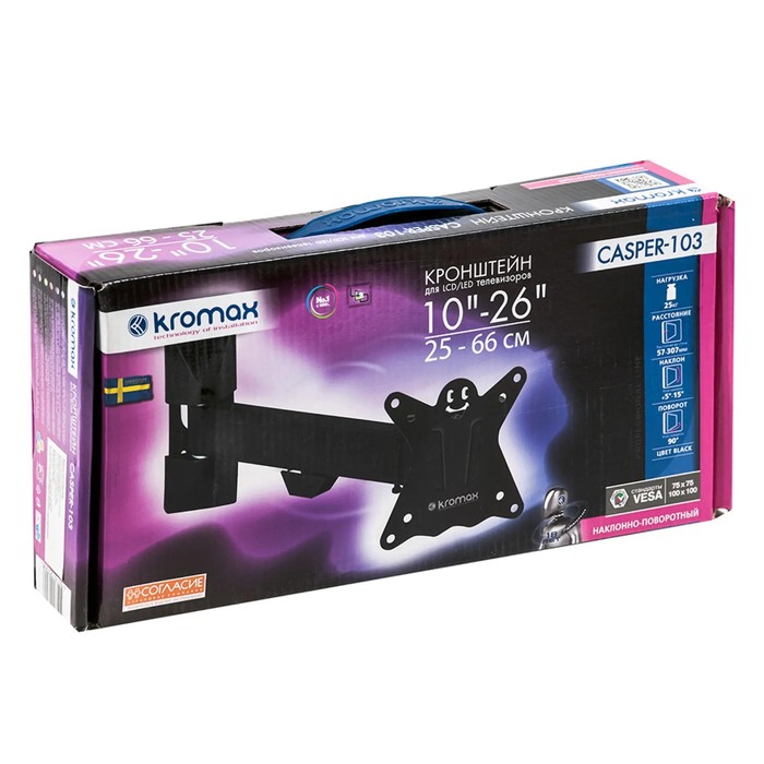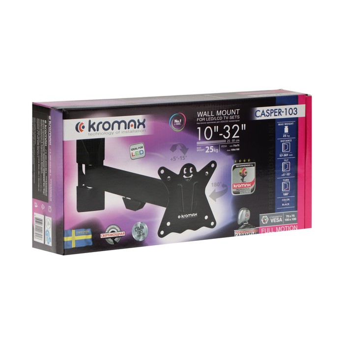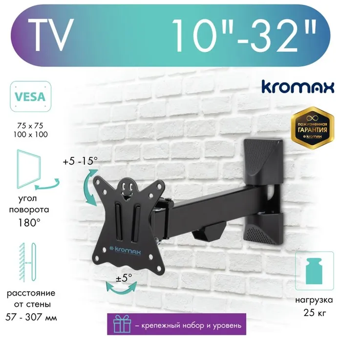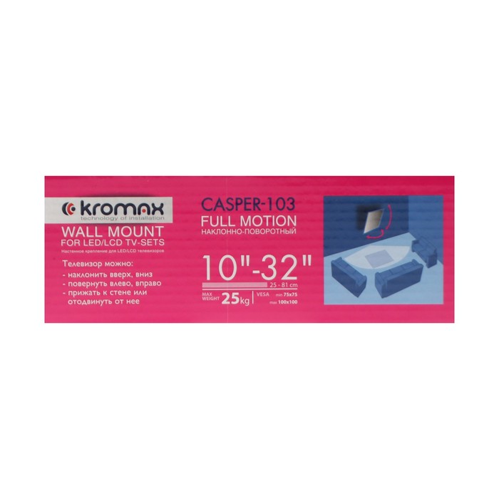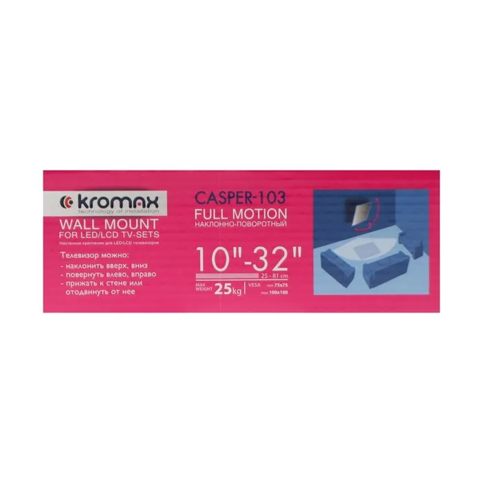 Кронштейн Kromax CASPER-103, для ТВ, наклонно-поворотный,10-32", до 25 кг, 25-81 мм, черный — Характеристики