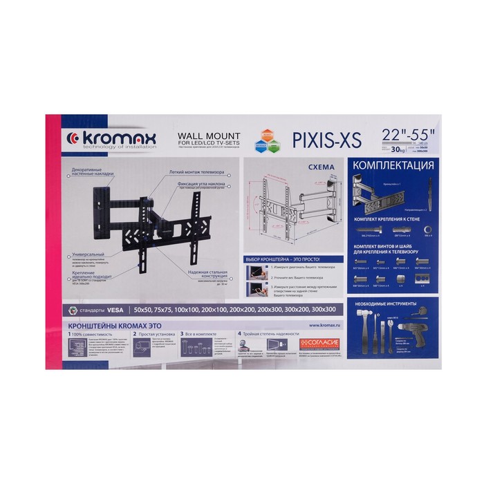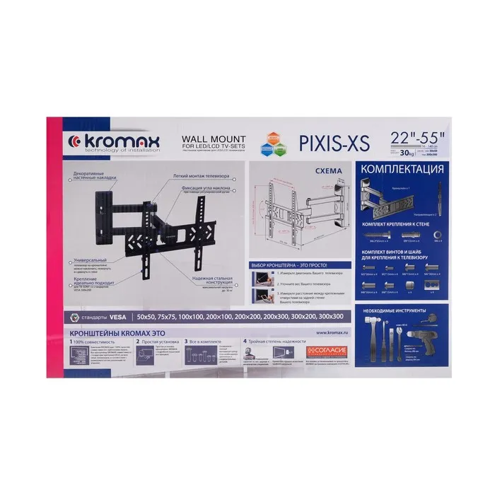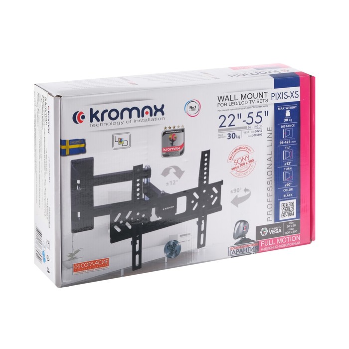 KROMAX PIXIS-XS BLACK надёжно удержит экран размером 22"-55" дюйма и весом 30 кг. Простая конструкция KROMAX PIXIS-XS BLACK идеально подойдет для самостоятельного монтажа. Наклонно-поворотная регулировка позволит наклонять вверх и вниз на ±12°, поворачивать влево и вправо на 180°, и выдвигать на 95-423 мм.