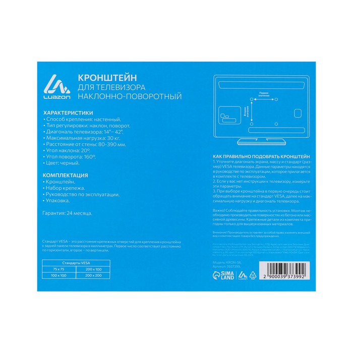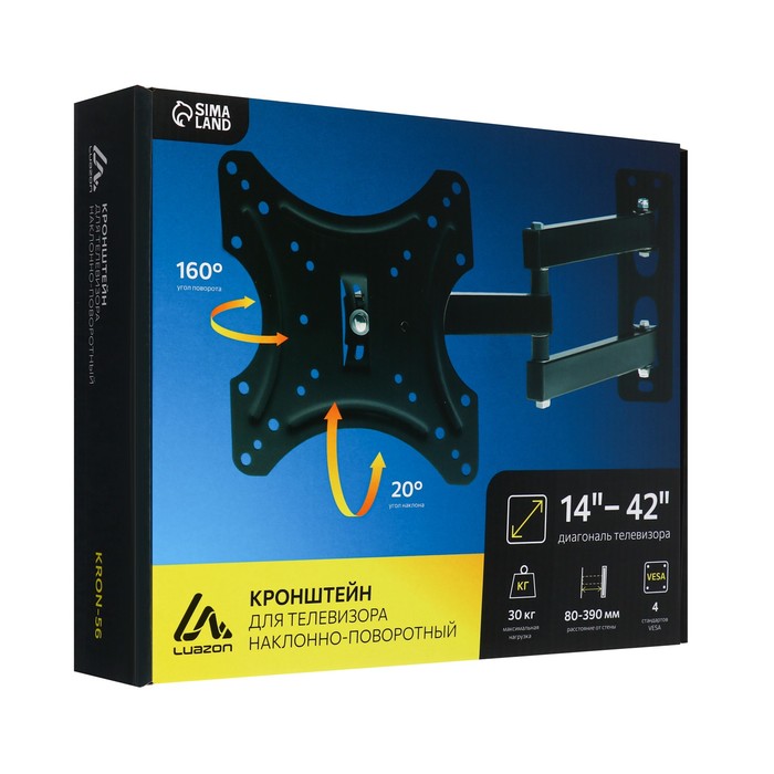 Кронштейн Luazon KrON-56, для ТВ, наклонно-поворотный, 14-42", 80-390 мм от стены, чёрный — Характеристики