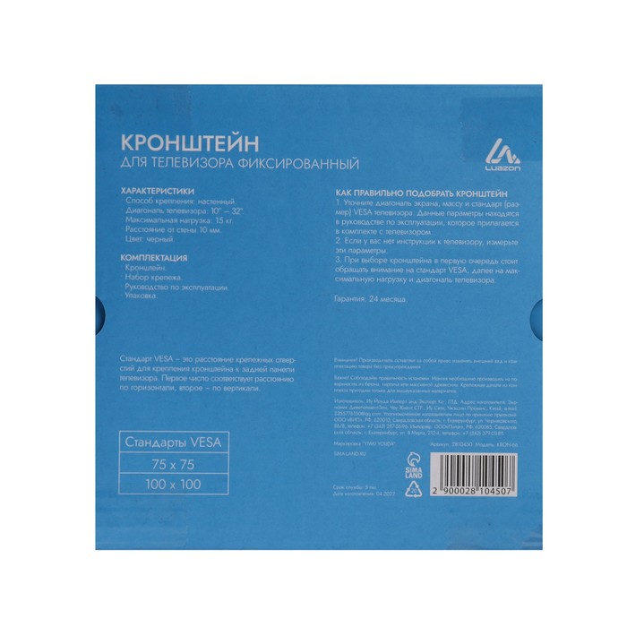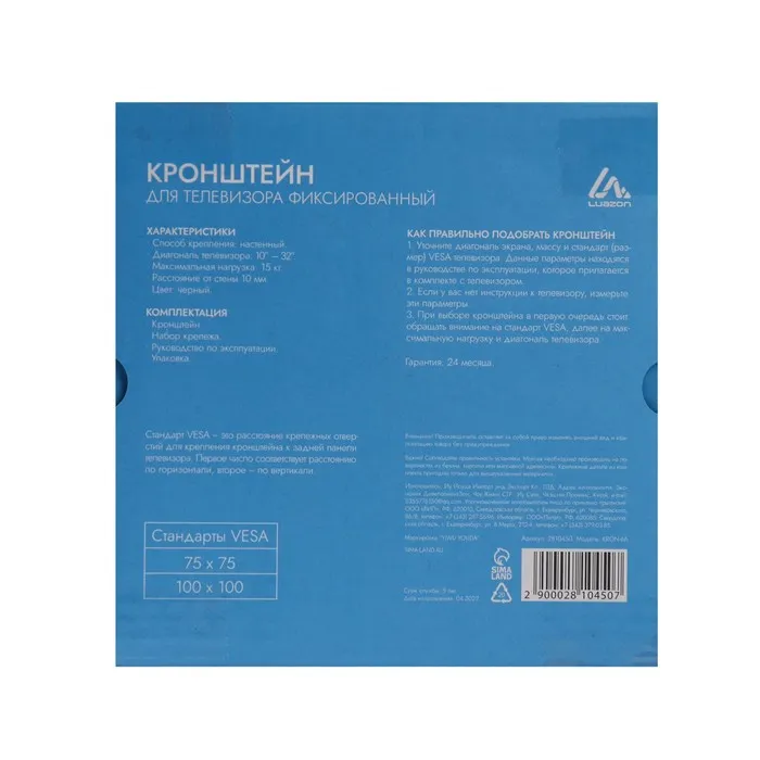 Кронштейн LuazON KrON-66, для ТВ, фиксированный, 10-32", 10 мм от стены, чёрный — Характеристики