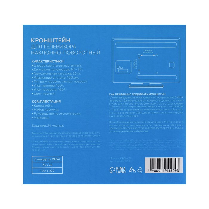 Кронштейн предназначен для крепления на стену большинства плоских телевизоров с диагональю от 14 до 32 дюймов. Выдерживает большую нагрузку, имеет прочный фиксирующий механизм, с помощью которого надёжно удерживает телевизор. Кроме того, в данной модели возможна регулировка наклона и поворота телевизора. Кронштейн позволяет закрепить телевизор в оптимальном положении как дома, так и в общественных местах.
