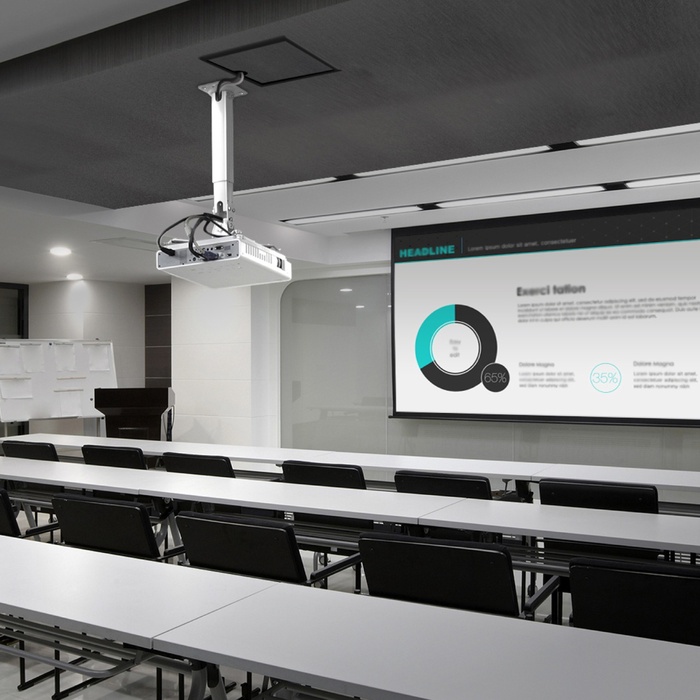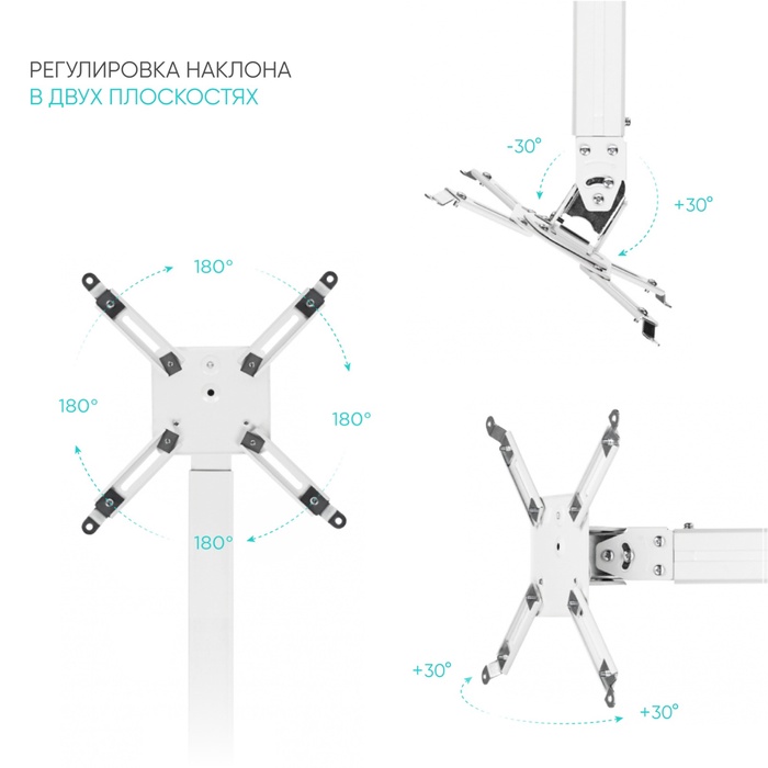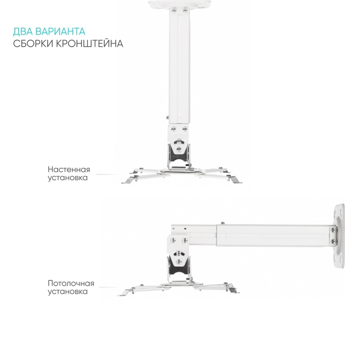 Такой кронштейн подходит для оборудования мультимедийных комнат, домашних кинотеатров, офисных и учебных пространств, где требуется надёжная фиксация проектора и гибкая настройка его положения. Он помогает освободить пространство, избежать загромождения мебели и обеспечить чёткую проекцию изображения практически в любой ситуации.