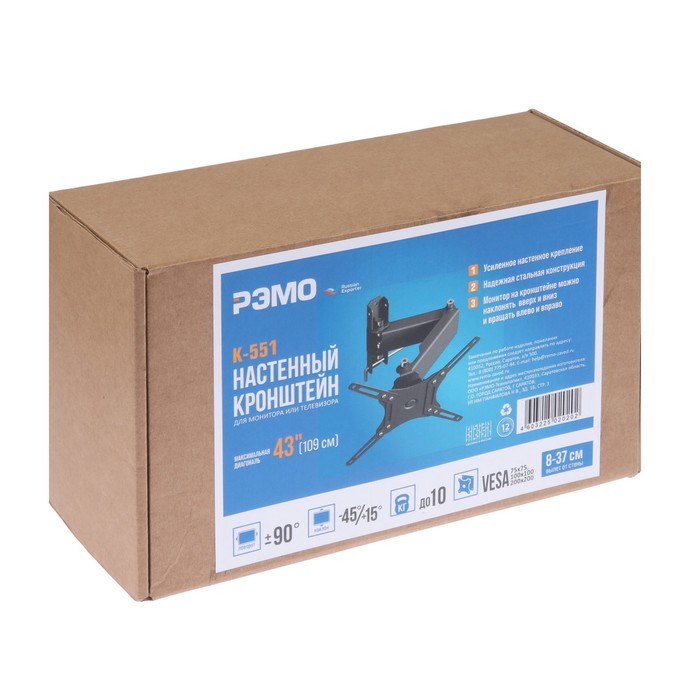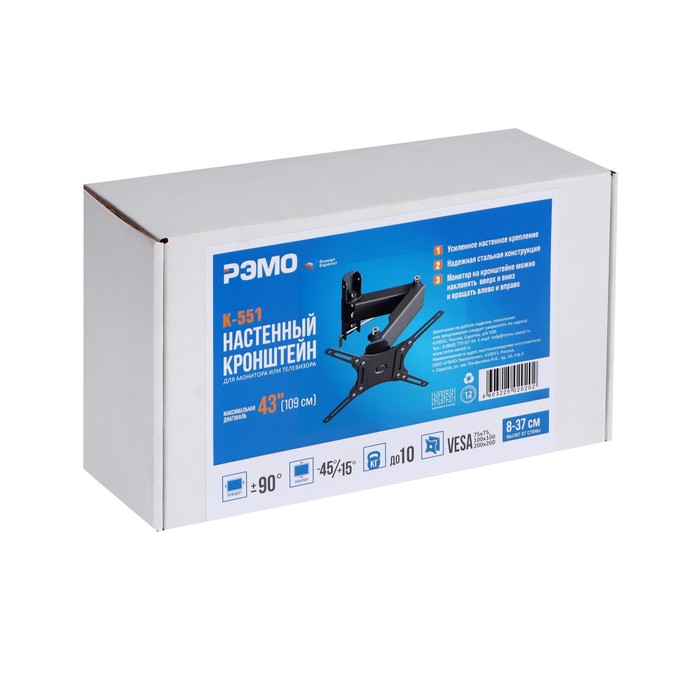 Кронштейн «РЭМО» К551, для ТВ, наклонно-поворотный, 13-43", чёрный — Характеристики