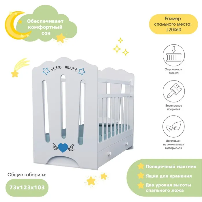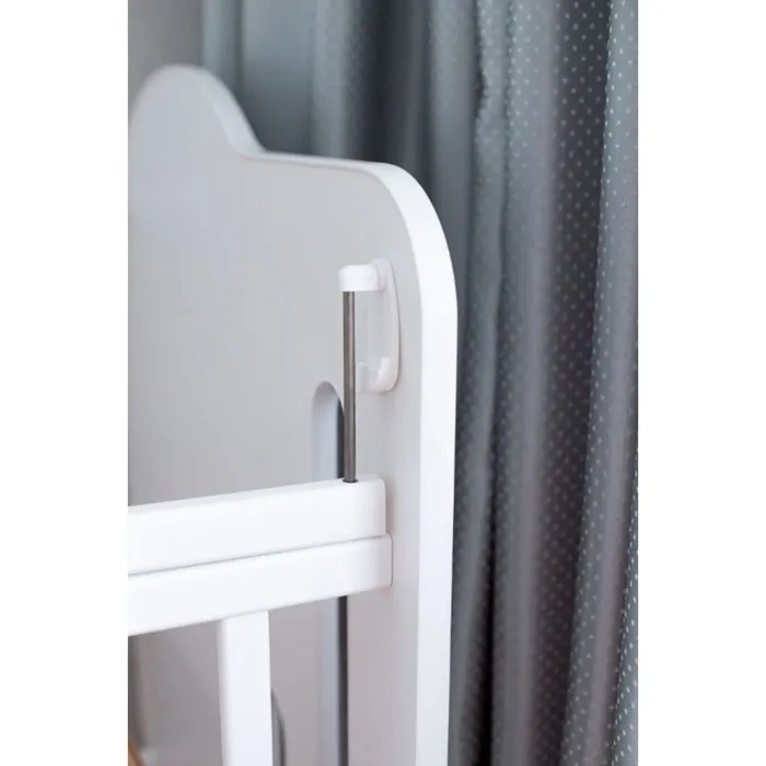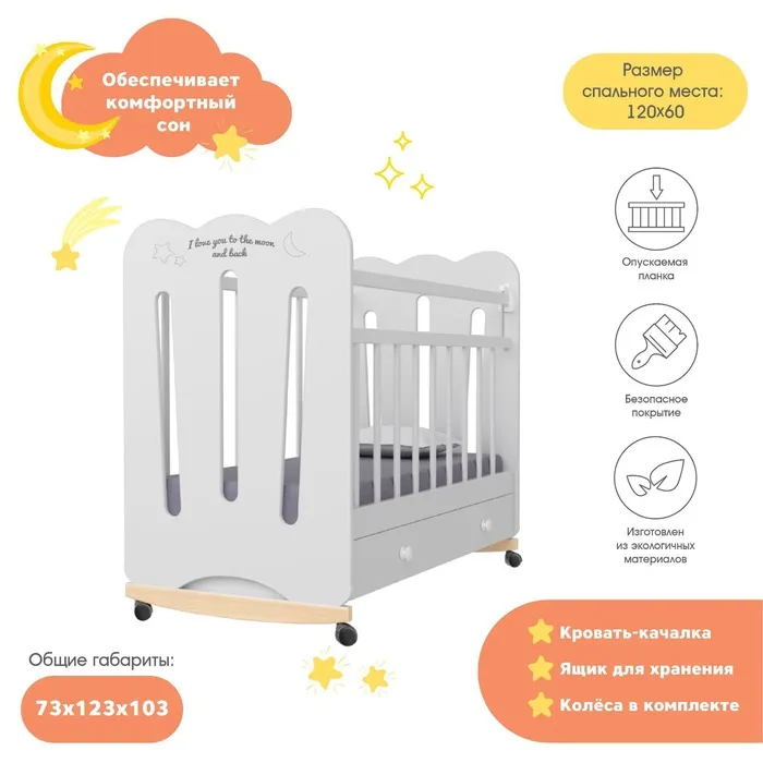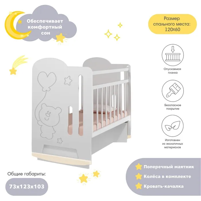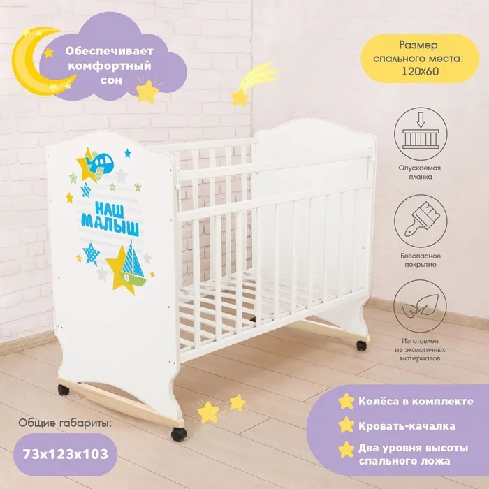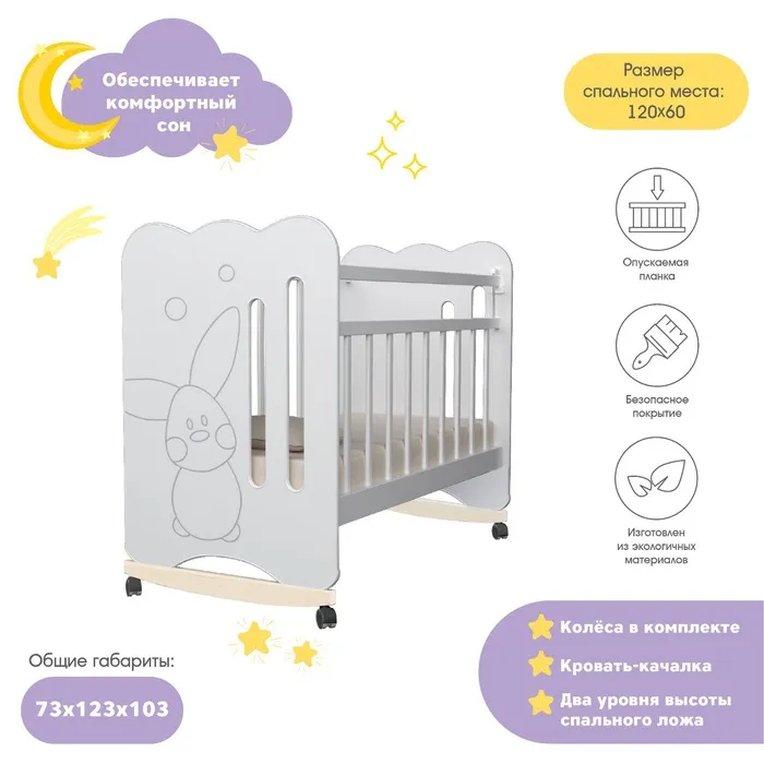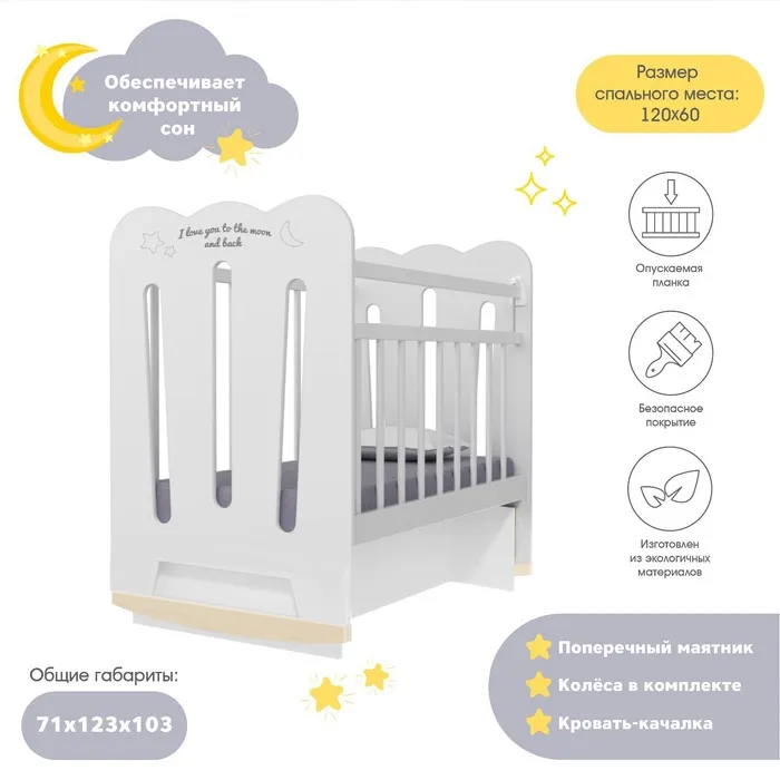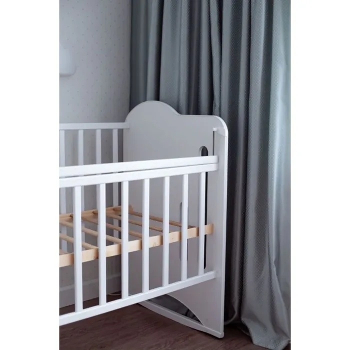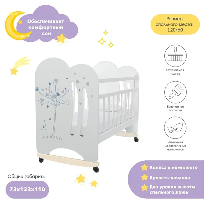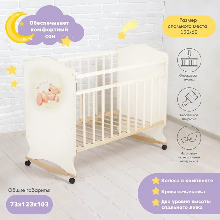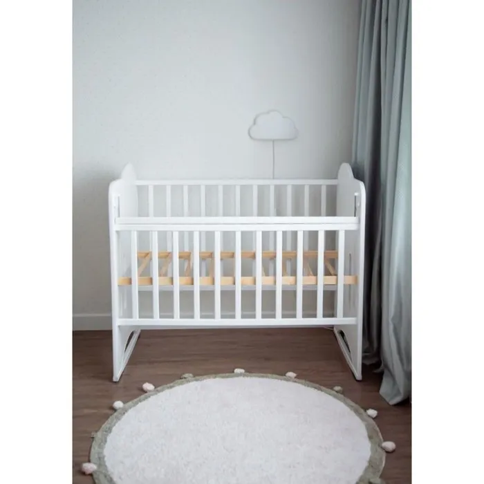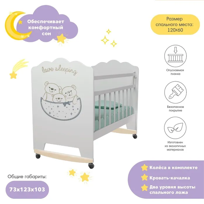 При снятых колесах кроватка превращается в качалку: успокоить и убаюкать новорожденного для вас не составит труда. Вам больше не придется низко наклоняться, чтобы уложить или достать из кроватки малыша. Планка и высота подматрасника регулируются. Мебель выполнена из натуральных материалов.
