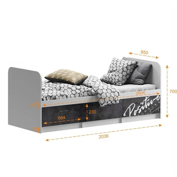 Кровать односпальная «Вега Позитив», спальное место 800×2000 мм, с ящиками, 2036×850×700 мм, цвет белый/бетон тёмный — Характеристики