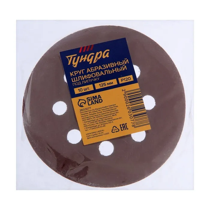 Круг абразивный шлифовальный под «липучку» ТУНДРА, перфорированный, 125 мм, Р120, 10 шт. — Характеристики
