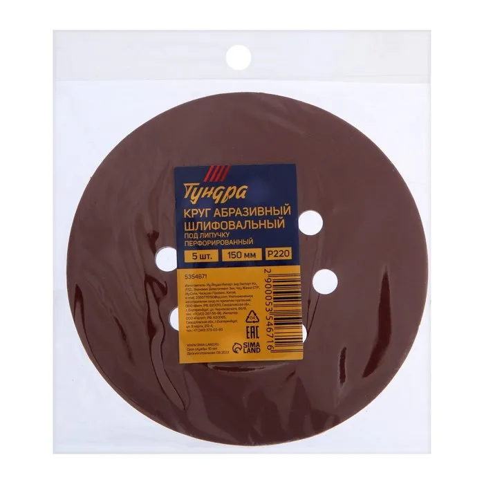 Круг абразивный шлифовальный под «липучку» ТУНДРА, перфорированный, 150 мм, Р220, 5 шт. — Характеристики