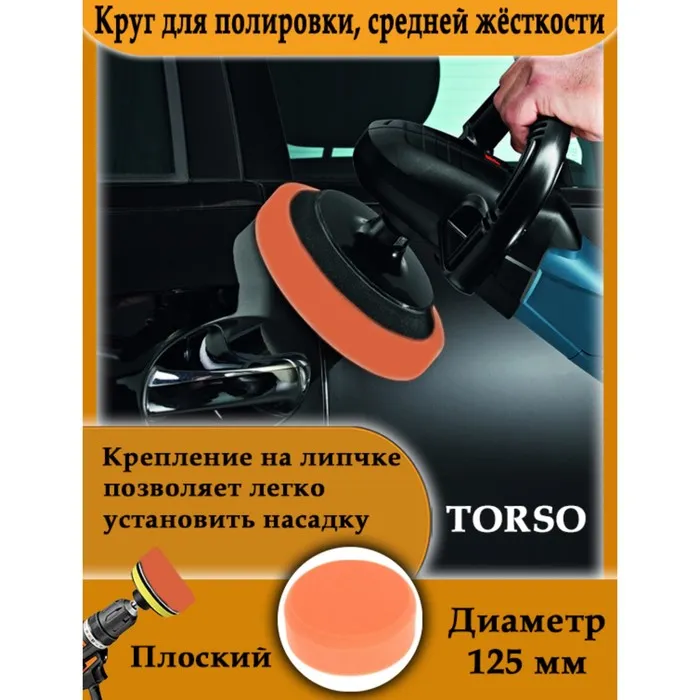 Круг TORSO крепится на полировальную машину с помощью специального пластикового адаптера. Изделие незаменимо при кузовном ремонте автомобиля и уходе за лакокрасочным покрытием. Пригоден для многоразового использования.