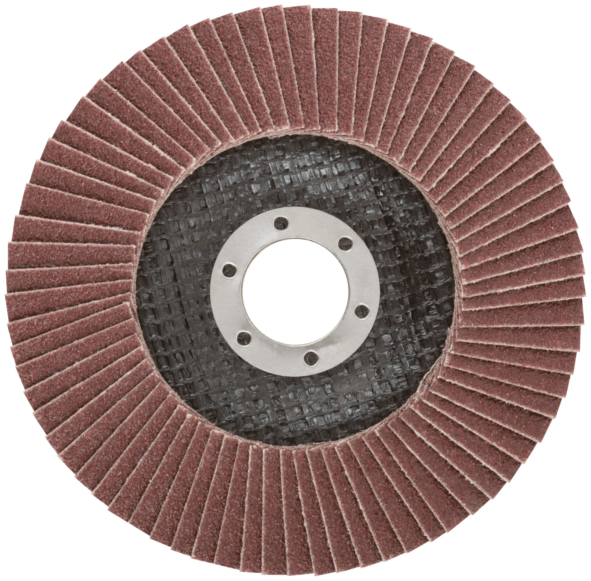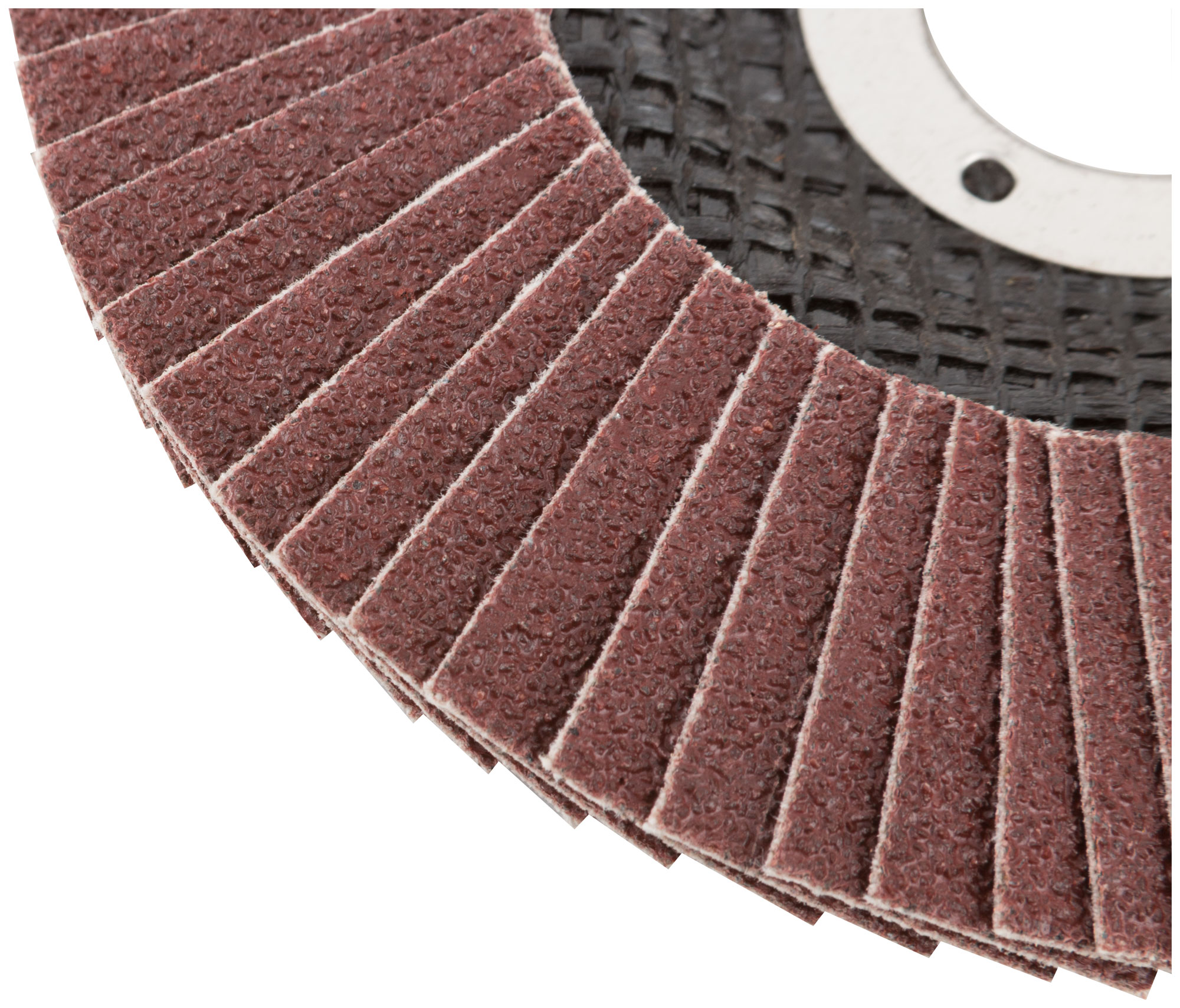 Лепестки на круге расположены под углом, что способствует более агрессивной обработке и равномерному распределению нагрузки. Материал изготовления включает в себя х/б ткань и стекловолокно, а абразивный слой выполнен из оксида алюминия, что обеспечивает высокую эффективность в работе.