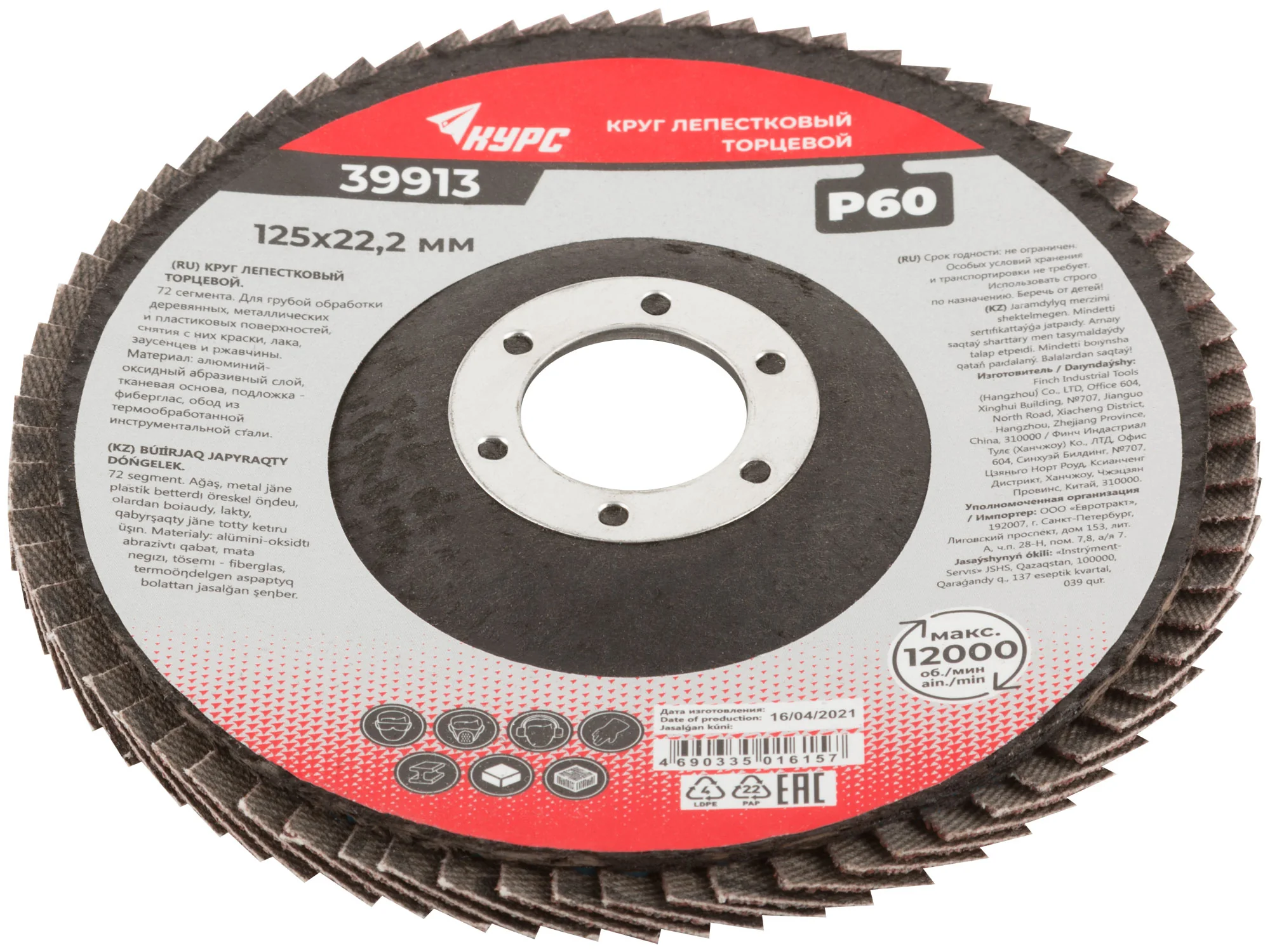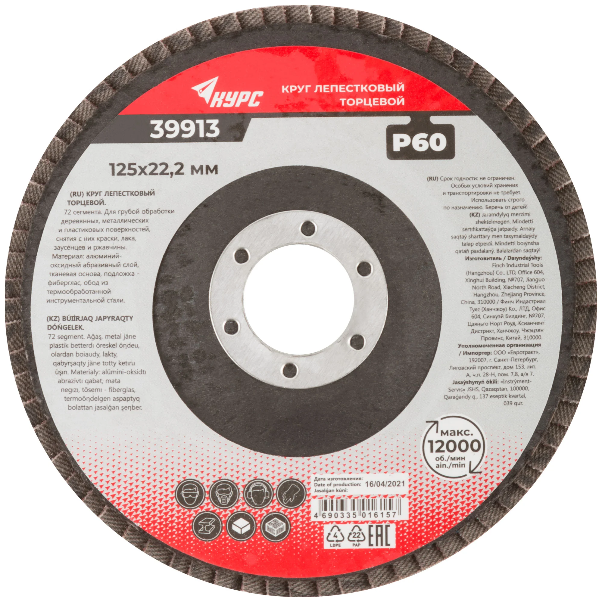 Круг лепестковый торцевой 125 мм P60 от бренда КУРС идеально подходит для использования с угловыми шлифовальными машинами (УШМ). Он позволяет быстро и качественно обрабатывать поверхности из металла, дерева и пластика, обеспечивая ровное шлифование и долгий срок службы.