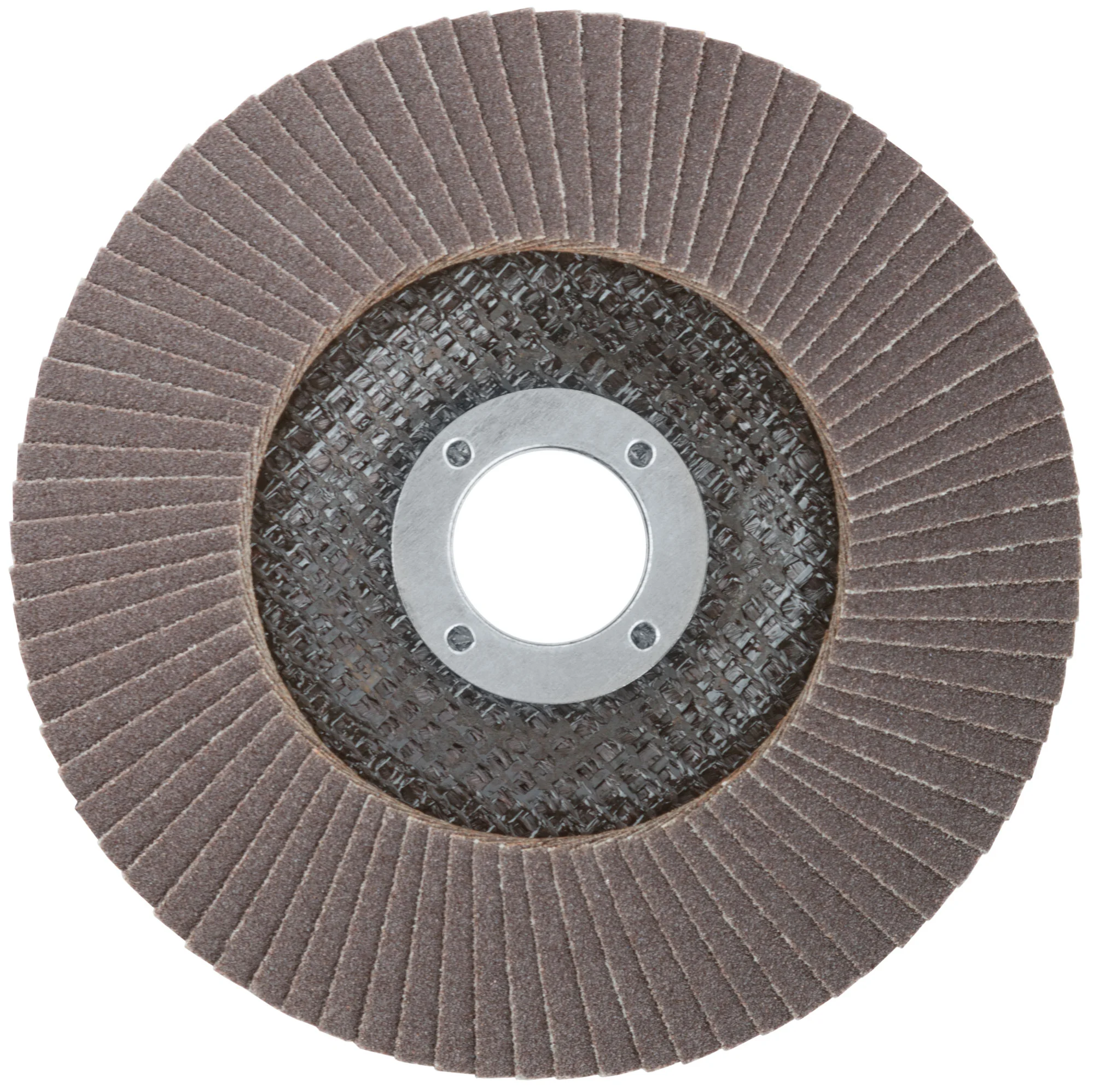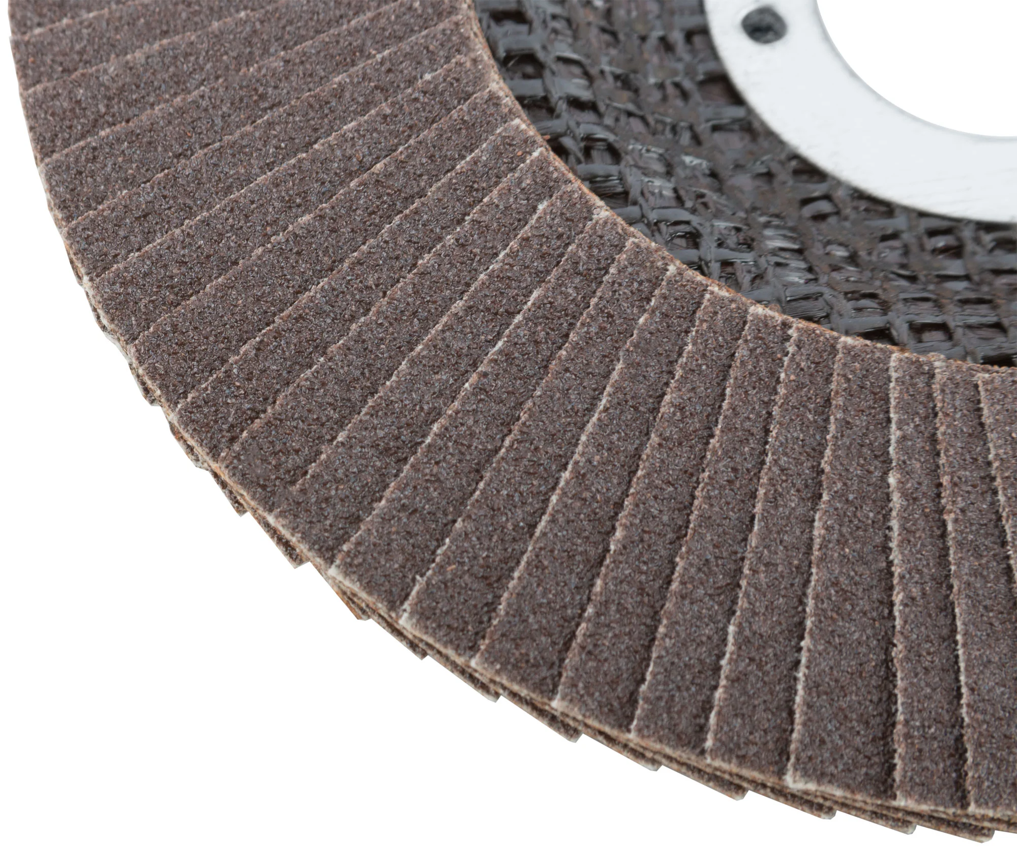 Лепестковый круг имеет наполняемость 80 лепестков с углом наклона 10 градусов, что существенно увеличивает его КПД и стойкость к износу. Посадочный диаметр составляет 22,2 мм, что делает его совместимым с большинством углошлифовальных машин.
