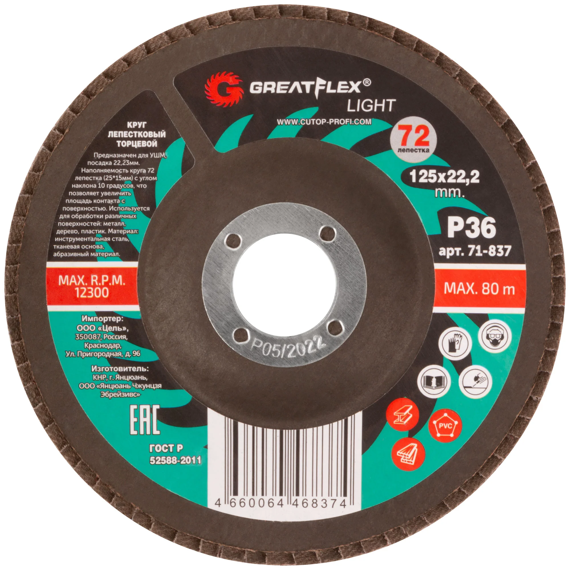 Круг лепестковый торцевой GreatFlex Light 125 х 22,2 мм, P36 для УШМ