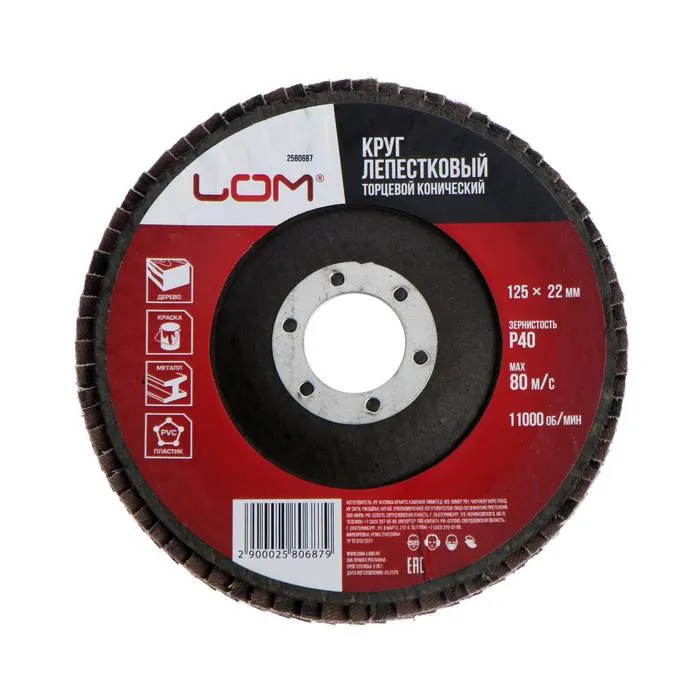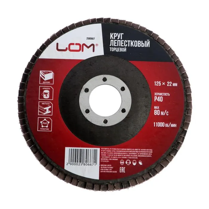 Круг лепестковый торцевой ЛОМ изготовлен из прямоугольных элементов шлифовальной шкурки на тканевой основе, которые расположены в виде веера на подложке из стекловолокна. Применяется в шлифовальных работах по дереву, пластмассе, металлу, и другим материалам.