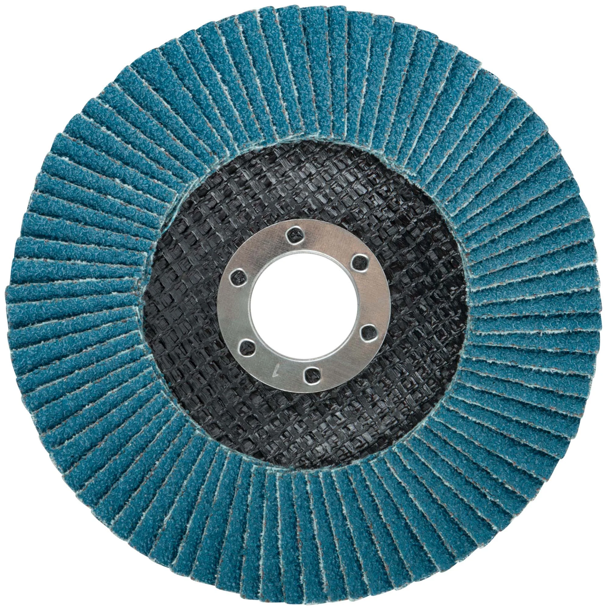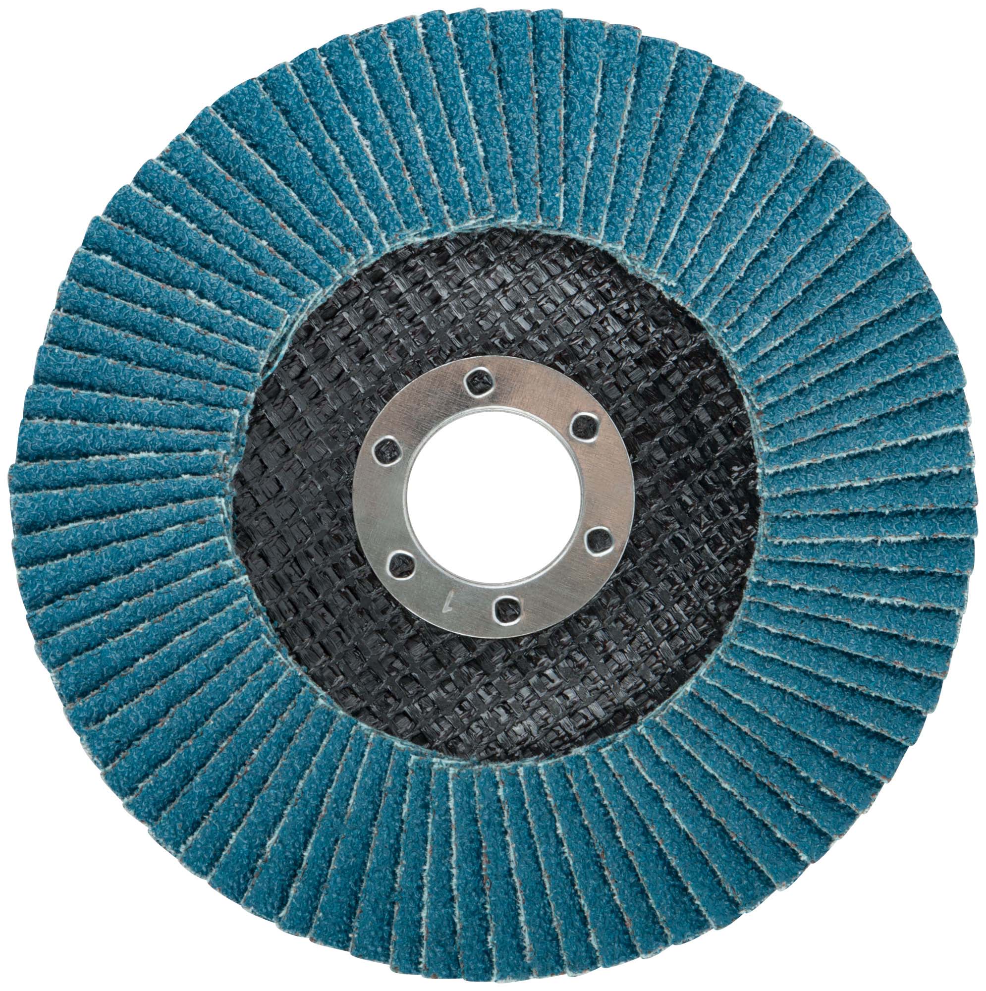 Круг диаметром 125 мм оснащен 80 лепестками, что обеспечивает равномерную обработку и долговечность. Абразивный слой выполнен из 100% циркония на основе из хлопчатобумажной ткани, а подложка из стекловолокна гарантирует прочность конструкции.