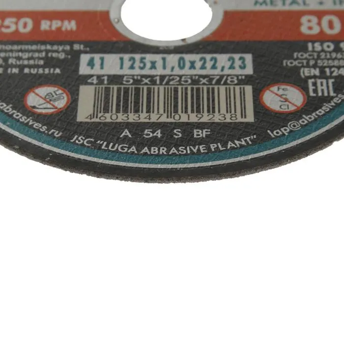 Круг отрезной по металлу «Луга» A 54 S BF 80 (14 А БУ), 125×1×22 мм — Характеристики
