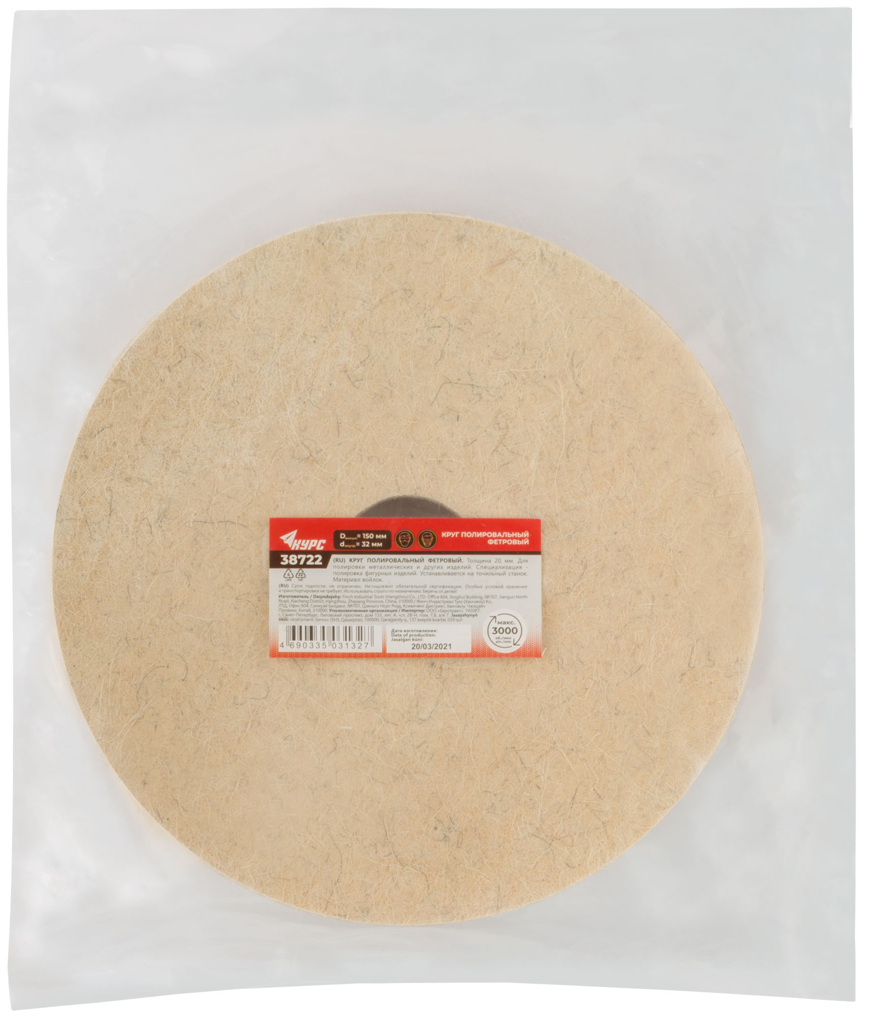 Ключевое преимущество фетрового круга в его способности эффективно полировать разнообразные материалы, снижая время и усилия на финишную обработку. Упаковка в полиэтиленовый пакет обеспечивает удобство хранения и транспортировки.