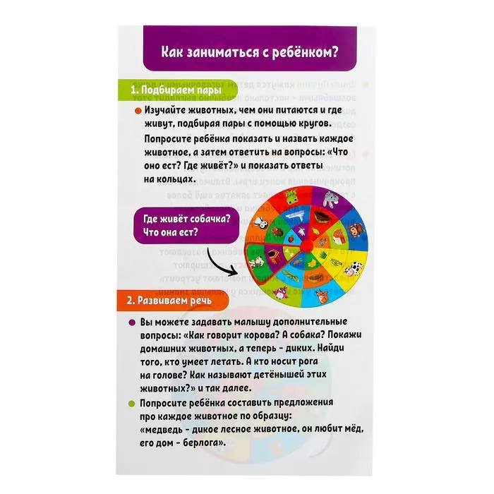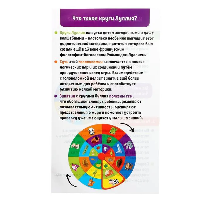 Суть этой игры заключается в поиске логических пар и соединений путём прокручивания колец. Занятия с головоломкой способствуют развитию мелкой моторики у ребёнка. Малыш пополнит словарный запас и расширит кругозор.