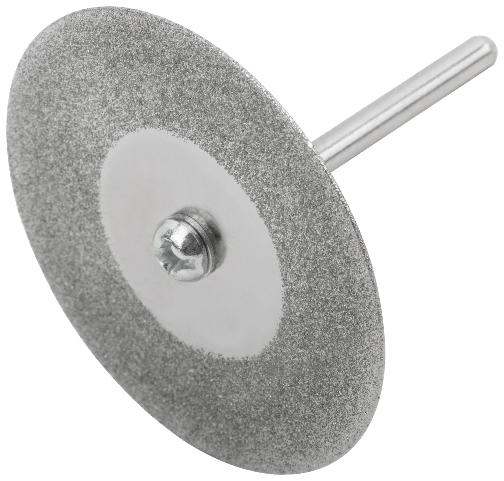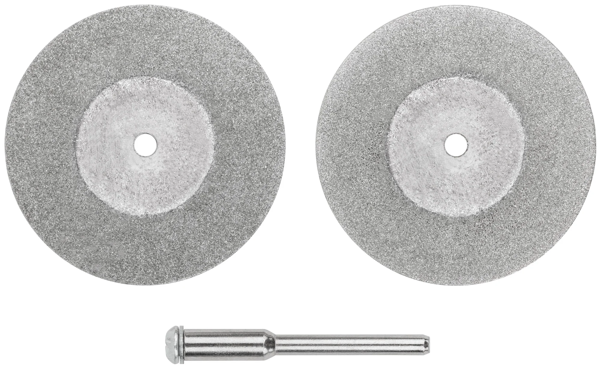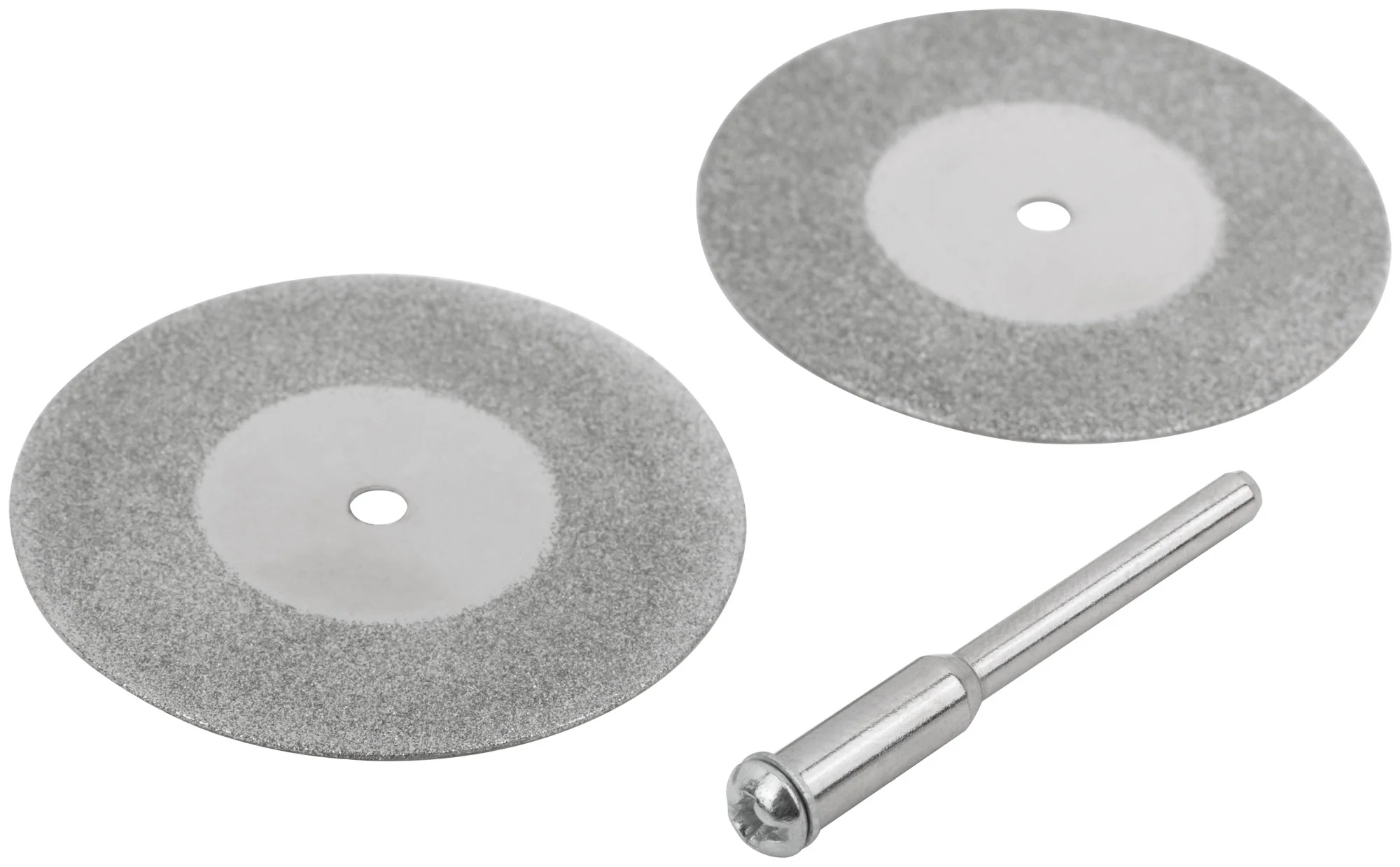 Круги изготовлены из инструментальной стали с режущей кромкой, содержащей порошок из технических алмазов, что обеспечивает долговечность и эффективность при работе с твердыми материалами. В комплект входит штифт диаметром 3,1 мм, который обеспечивает надежное крепление и стабильность при резке.