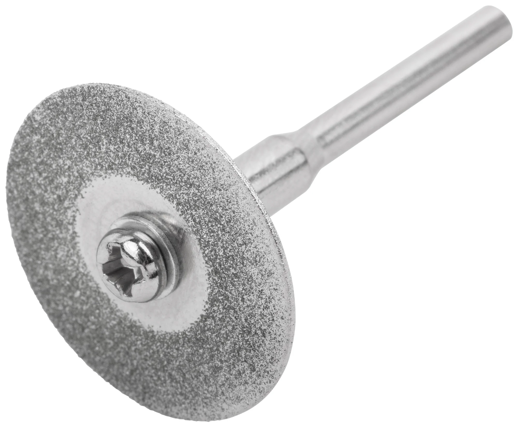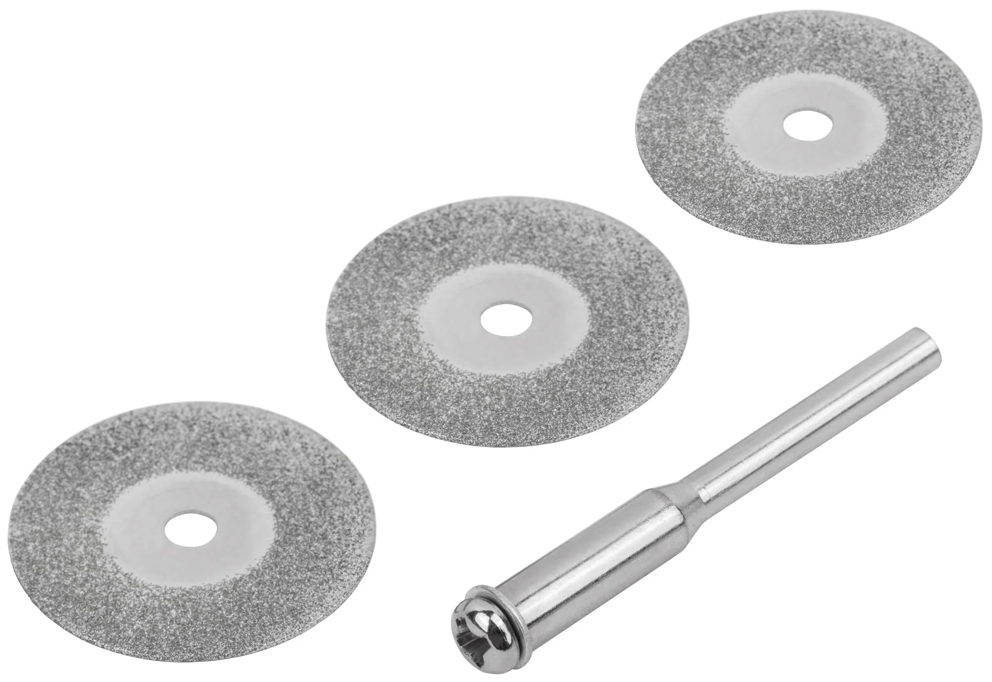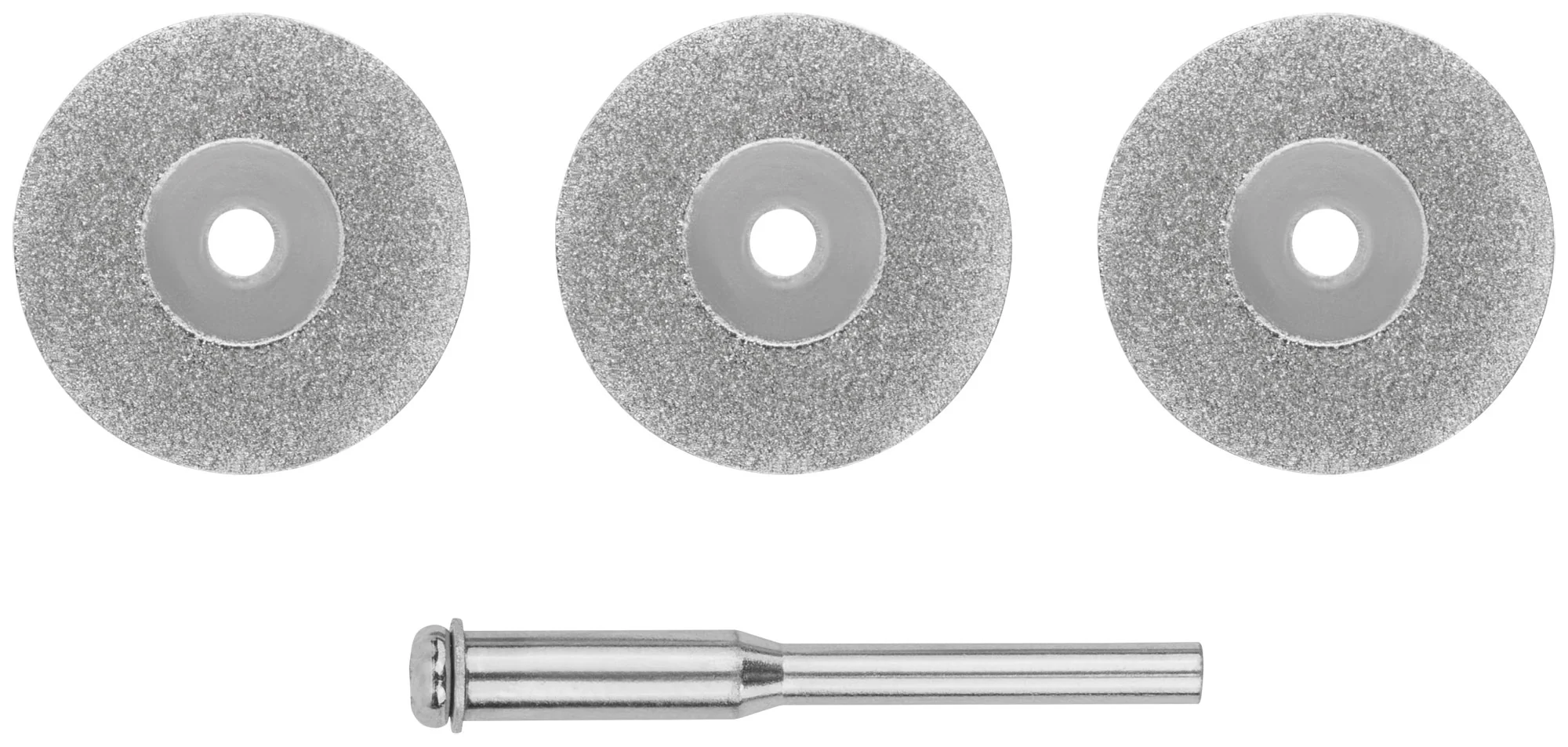 Инструментальная сталь, из которой изготовлены круги, обеспечивает прочность и долговечность. Режущая кромка каждого круга содержит порошок из технических алмазов, что значительно повышает его эффективность и скорость резки. Комплект включает три алмазных круга и штифт диаметром 3,1 мм, что обеспечивает простоту установки и надежность в работе.