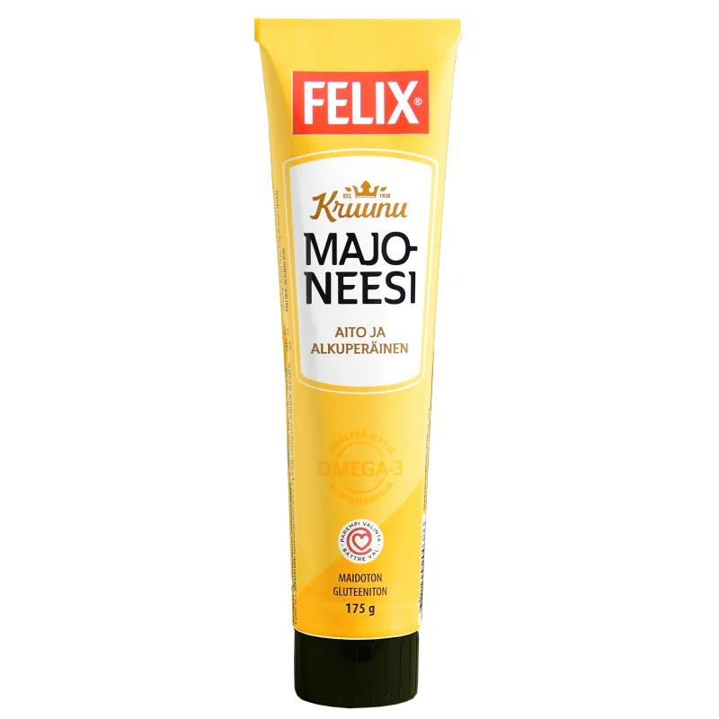 Круунумайонези идеально дополнит ваши начинки, гамбургеры и соусы. Только ваше воображение является пределом! Без лактозы, без глютена, без молока. Упаковка 175 г. Мы постоянно обновляем информацию о продукте. Однако всегда рекомендуется проверять информацию на упаковке.