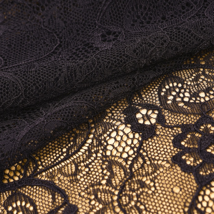 Чёрное кружево с эластичностью из нейлона и спандекса станет вашей главной находкой для создания элегантных и стильных проектов. Эта роскошная ткань идеально подходит для шитья утончённого белья, модной одежды или изысканных аксессуаров. Сочетание тонкой фактуры и упругости делает её универсальной для любого творческого замысла.