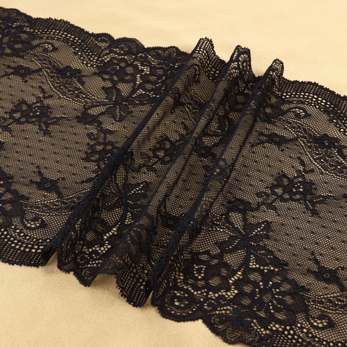 Создайте уникальные проекты! Эластичная черная кружевная ткань, шириной 240 ммэто идеальный материал для креативных решений в моде и дизайне. Комбинация нейлона и спандекса придаёт ткани прочность и эластичность, создавая динамичные образы и комфортные изделия.