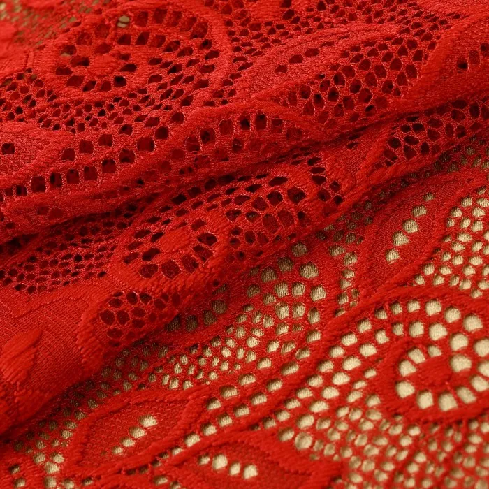 Эластичное кружевное полотно не имеет тканной основы. Благодаря своей пластичности кружево тянется, а переплетения нитей формируют воздушную выразительность.