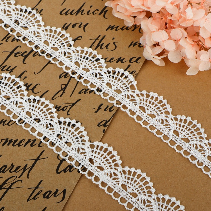 Познакомьтесь с изысканным белым кружевом из полиэстера шириной 25 мм, который станет прекрасным дополнением к вашему швейному проекту. Это кружево длиной 6,8 метра придаст вашим изделиям элегантный и утончённый вид, идеальный для создания штор, скатертей, одежды или аксессуаров.