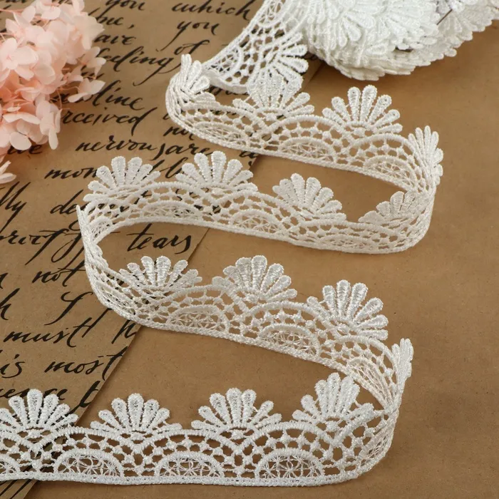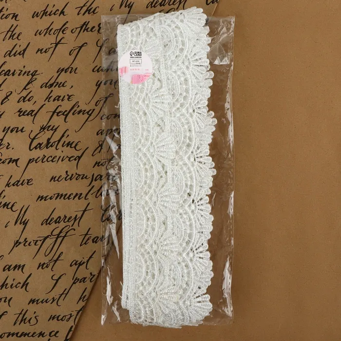 Кружево становится изящным решением для отделки свадебных аксессуаров, создания текстильной бижутерии и декорирования домашнего текстиля. Ажурная структура хорошо драпируется, образуя мягкие складки. Материал не осыпается при нарезке, сохраняя четкость краев, и надежно фиксируется на различных поверхностях.