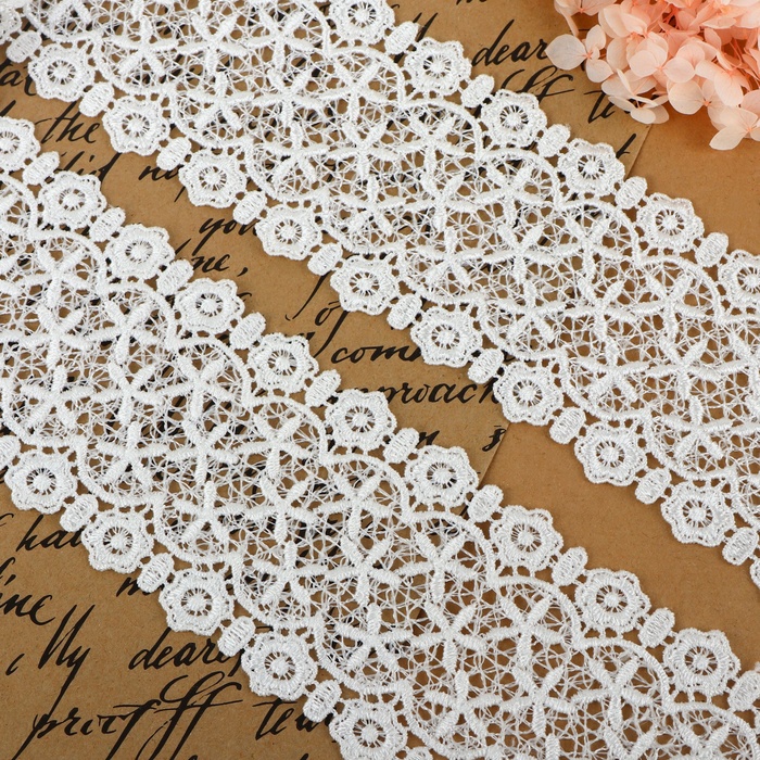 Плетеное кружево с гипюрной стилистикой поможет реализовать самые смелые дизайнерские идеи. Используйте это полотно, чтобы украсить одежду, аксессуары или элементы интерьера. Материал идеально подойдёт для создания романтических и винтажных образов, внесёт оригинальность и стиль в ваши работы.