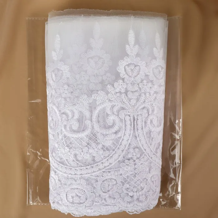 Неэластичная ткань с изысканным повторяющимся узором по краю. Кружево не тянется, а тонкая сетка придаёт любому изделию с кружевом лёгкости и элегантности. С таким кружевом удобно работать, ткань легко драпируется и не крошится по краям. Можно использовать для пошива нижнего белья, платьев, топов, палантинов, а также для декорирования аксессуаров: перчаток, головных уборов и так далее.