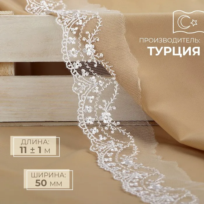 Кружево на сетке, 50 мм, 11±1 м, белое — Характеристики