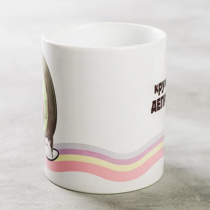 Кружка изготовлена из керамики. Рисунок нанесён методом сублимации, при котором краска проникает в верхний слой изделия, поэтому изображение получается стойким.