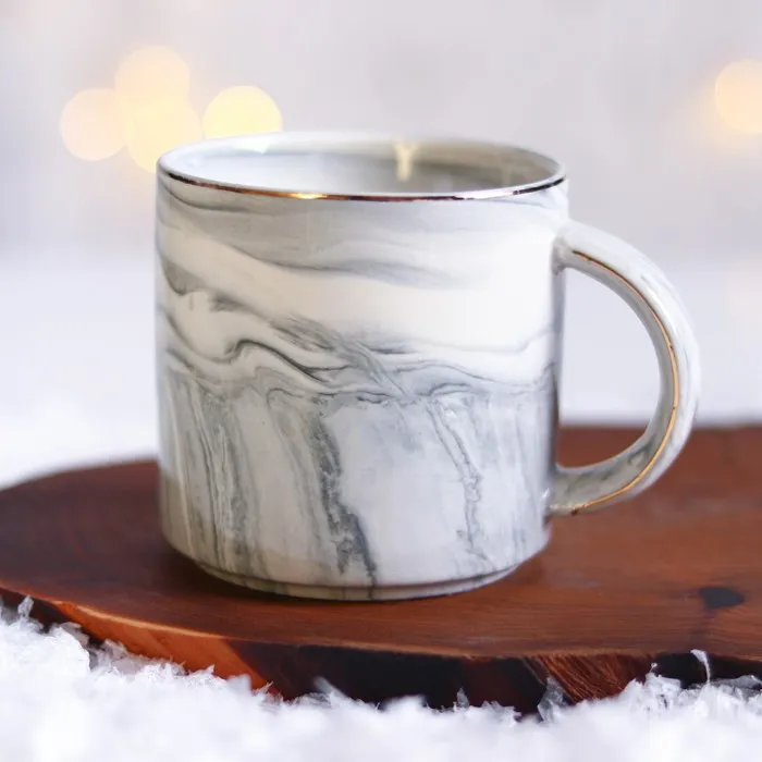 - Мраморный узор придаёт кружке изысканность и элегантность.
