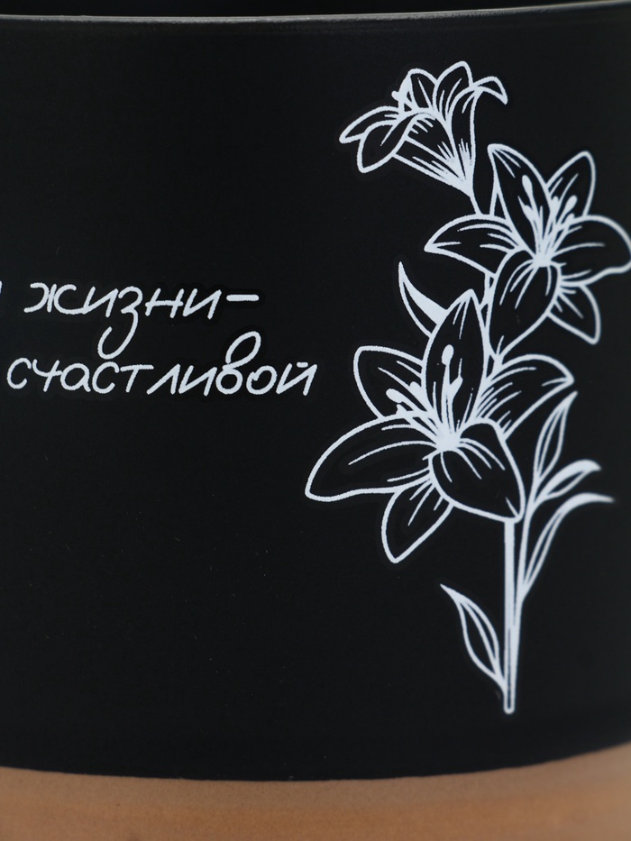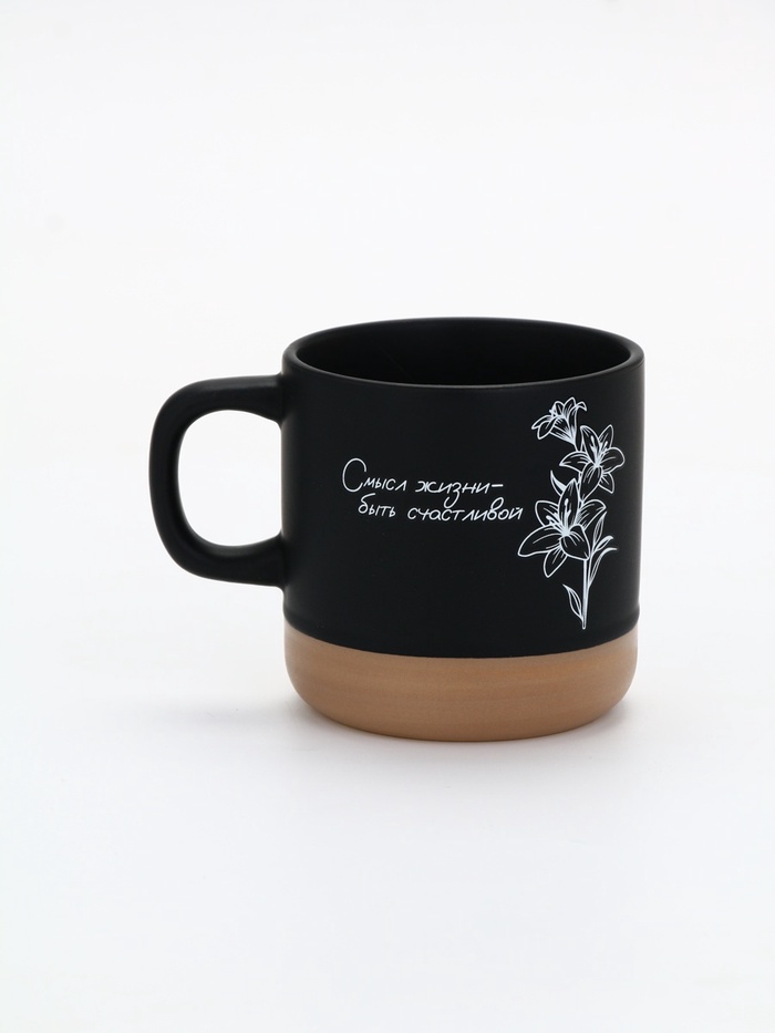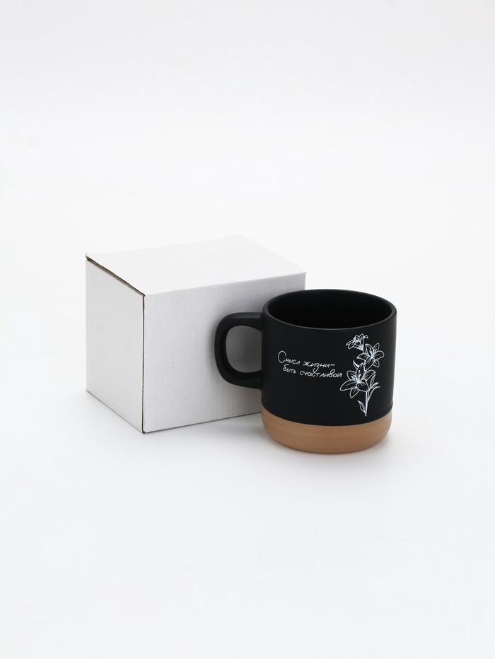 Кружка «С нежностью» — это тихий жест доброты, оформленный в керамику. Чёрная поверхность, как фон для искренних слов, бежевый низ — как основа тепла и уюта, белая надпись ”Смысл жизни — быть счастливой” и лёгкие цветочные мотивы — не декор, а завершение фразы без пафоса. Здесь нет требований к радости, только мягкая уверенность: счастье возможно — и оно начинается с малого.