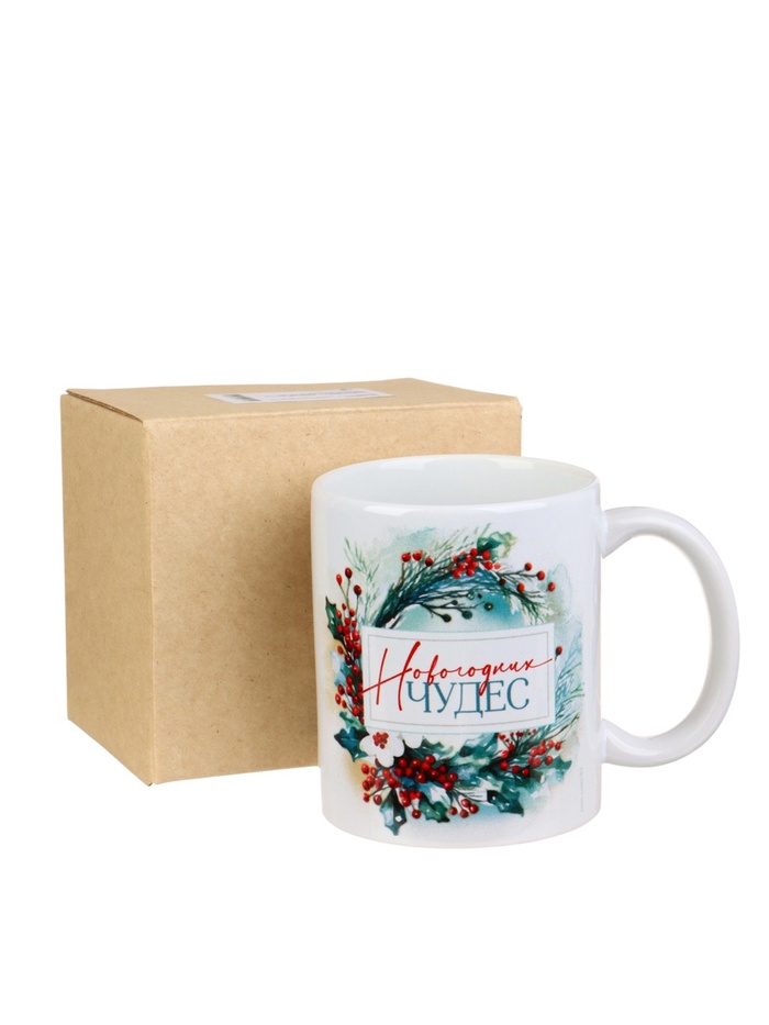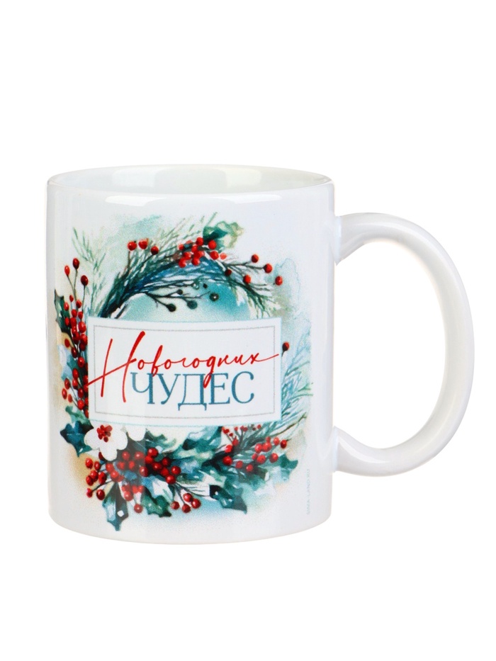 Кружка «Новогодних чудес» — это зимняя сказка, умещающаяся в ладони. Белая керамика, как первый снег на подоконнике, и сублимационный рисунок: лошадка-качалка и венок из омелы — символы тепла, уюта и старинных обычаев, переданные без пафоса, но с искренностью. Надпись ”Новогодних чудес” не завершается восклицанием — она звучит как пожелание, произнесённое в полголоса, чтобы оно не рассеялось в суете.
