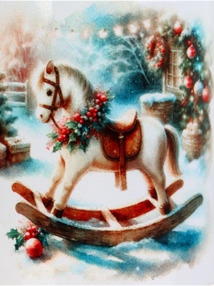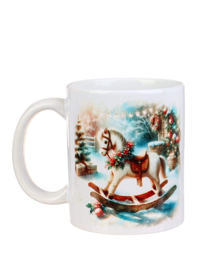 Эта кружка похожа на тот момент, когда, уже раздевшись после улицы, ты замечашь, что ёлка в углу мягко мерцает, и в доме пахнет корицей — и вдруг понимаешь: праздник уже здесь. Лошадка-качалка — не просто игрушка, а связь с детством, когда вера в чудо не требовала доказательств. А венок из амелы — не просто украшение, а намёк на то, что самые тёплые традиции передаются не через громкие ритуалы, а через жесты.