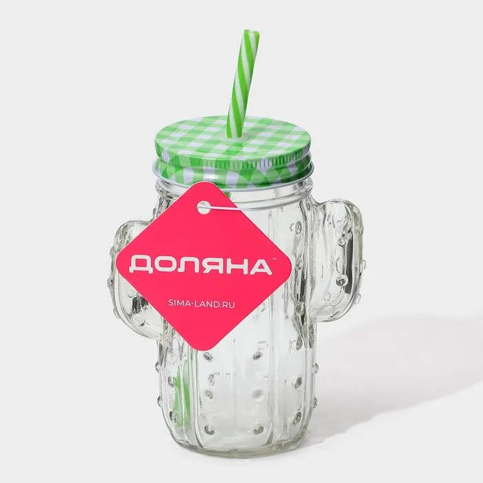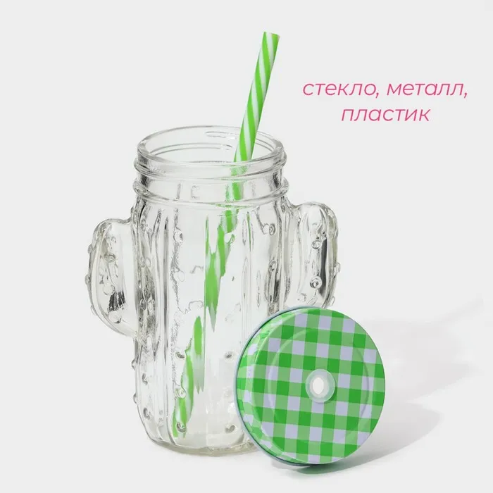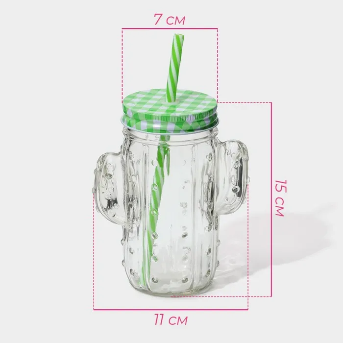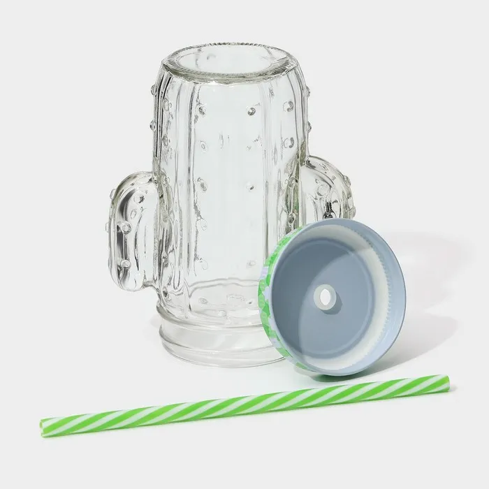 Кружка Доляна «Кактус», 450 мл, 11×7×15 см, стекло, с крышкой и трубочкой, прозрачная — Характеристики
