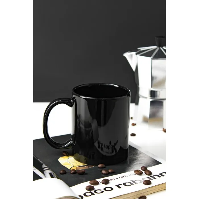 Кружка выполнена из качественной керамики, что обеспечивает её долговечность и устойчивость к сколам. Гладкая текстура и однотонный черный цвет придают изделию строгий и благородный вид, делая его подходящим как для уютных домашних посиделок, так и для деловых встреч.