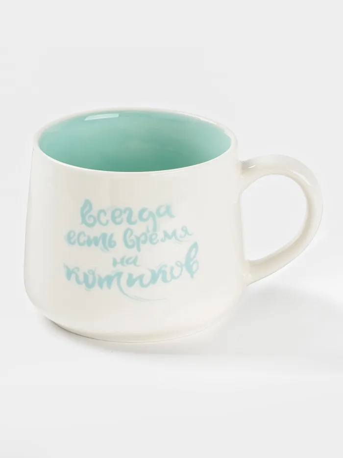 Очаровательная керамическая кружка объемом 360 мл в нежных бело-бирюзовых тонах. Украшена милой фигуркой котика внутри и надписью "Всегда есть время на котиков!". Отличный способ сделать перерыв и поднять себе настроение. Подходит для использования в микроволновой печи и посудомоечной машине – для вашего удобства!