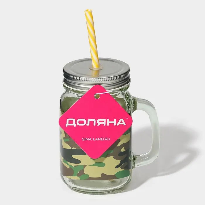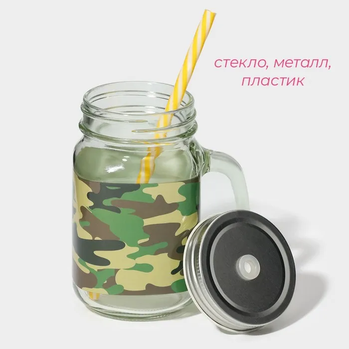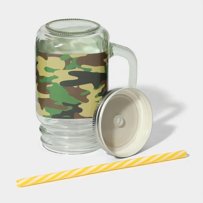Кружка Доляна «Милитари», 450 мл, 10×7.5×13 см, с крышкой и трубочкой, стекло, прозрачная, зелёная — Характеристики