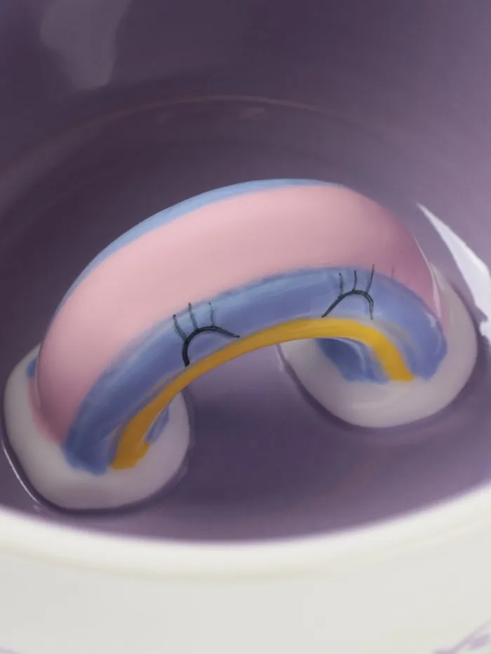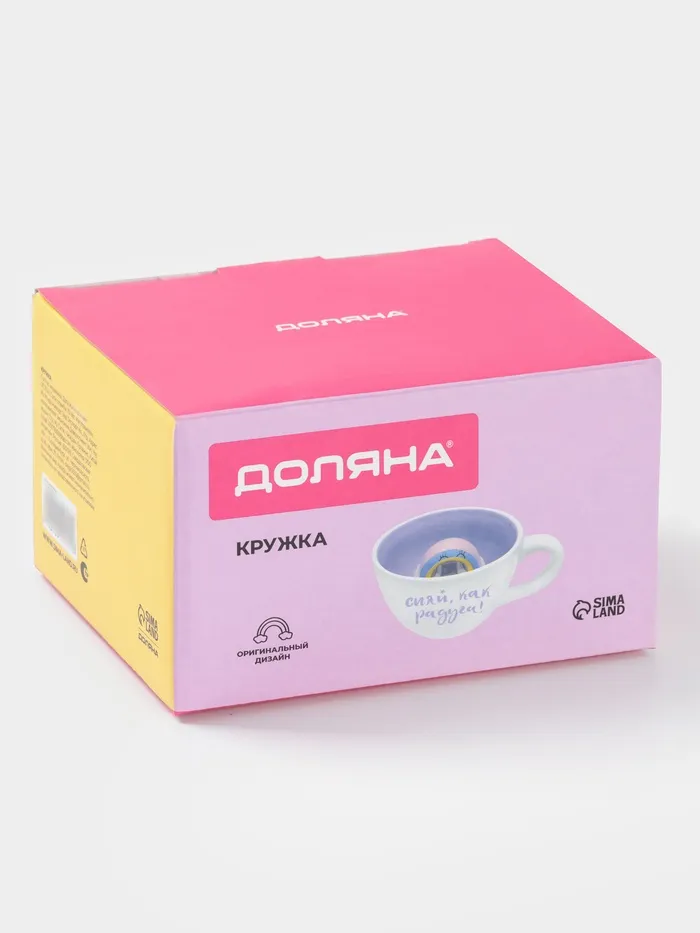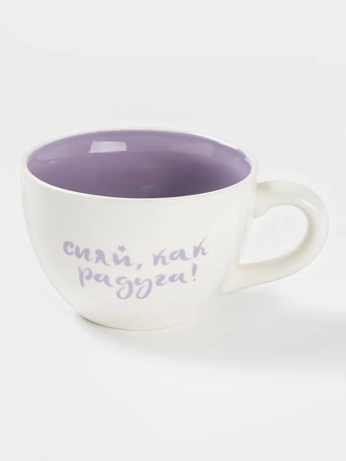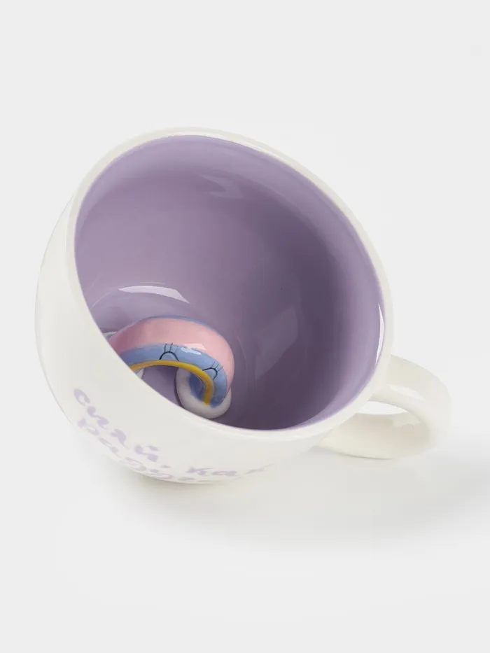 Яркая керамическая кружка большого объема (475 мл) в нежных бело-сиреневых тонах. Внутри – милая фигурка, а снаружи – вдохновляющая надпись «Сияй как радуга!». Идеальный подарок для тех, кто верит в себя и не боится быть собой. Можно использовать в микроволновой печи и посудомоечной машине.