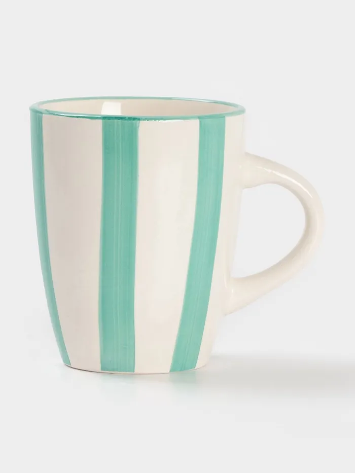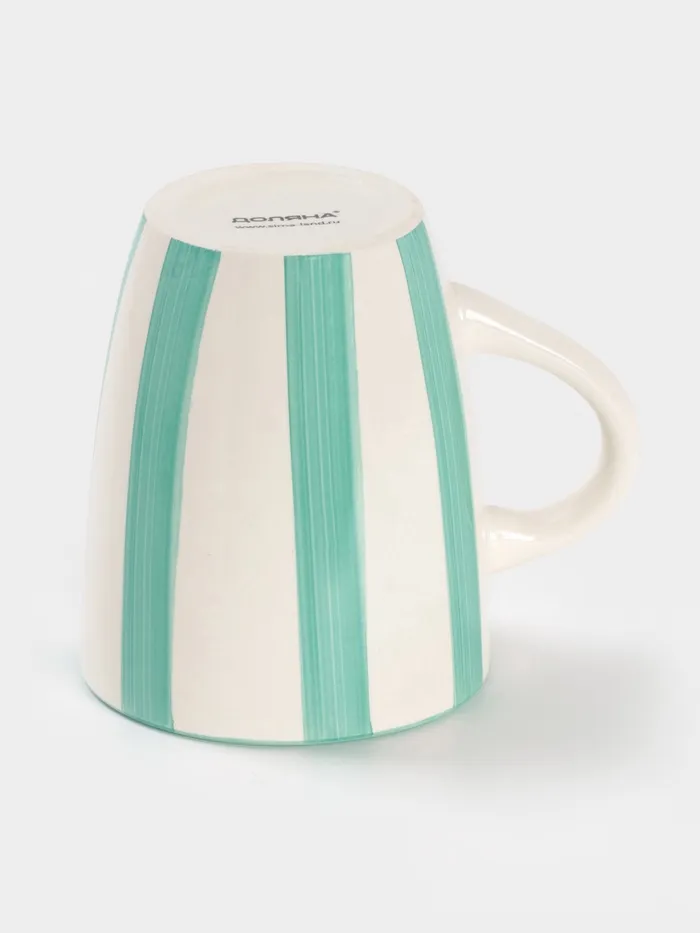 Эта керамическая кружка с мягкими бирюзовыми полосами добавит свежести в ваши утренние ритуалы. Объем 360 мл (13×9.1×10.5 см) создает оптимальный баланс между компактностью и удобством использования.