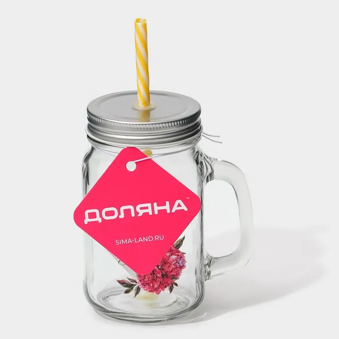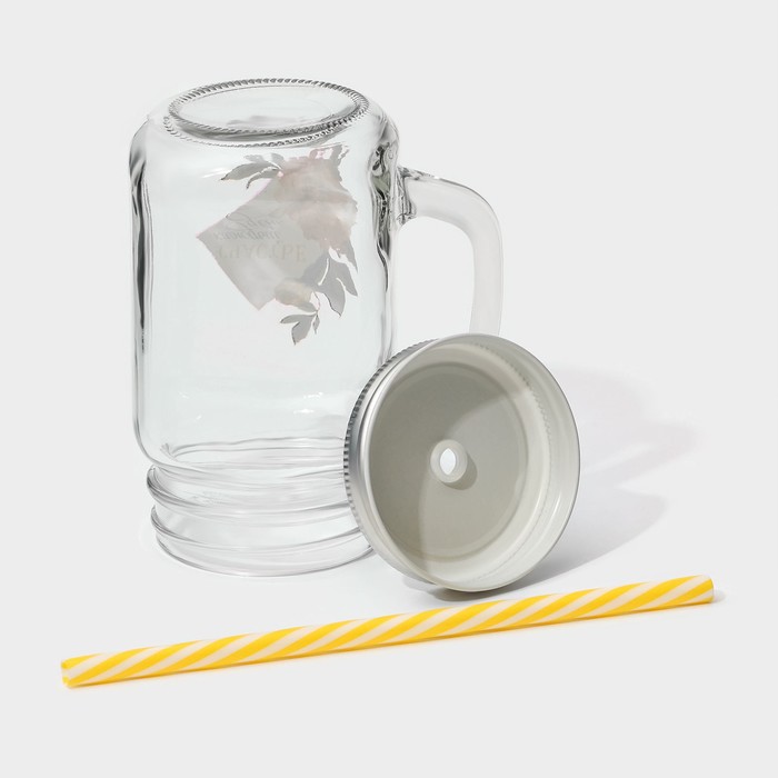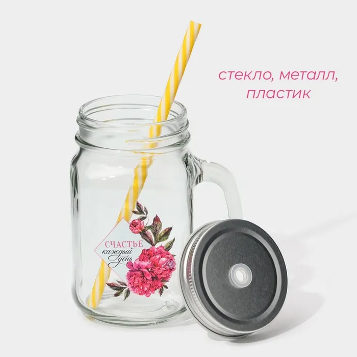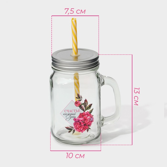 Кружка Доляна «Счастье», 450 мл, 10×7.5×13 см, с ручкой, крышкой и трубочкой, стекло, прозрачная — Характеристики