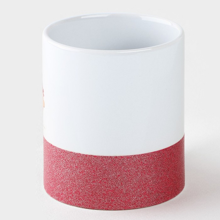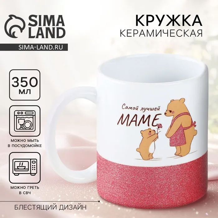 - Дизайн кружки выполнен в белом цвете с блестящей вставкой внизу и рисунком с надписью "Самой лучшей маме".