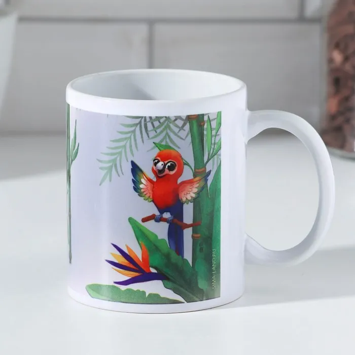 Кружка изготовлена из керамики. Рисунок нанесён методом сублимации, при котором краска проникает в верхний слой изделия, поэтому изображение получается стойким.