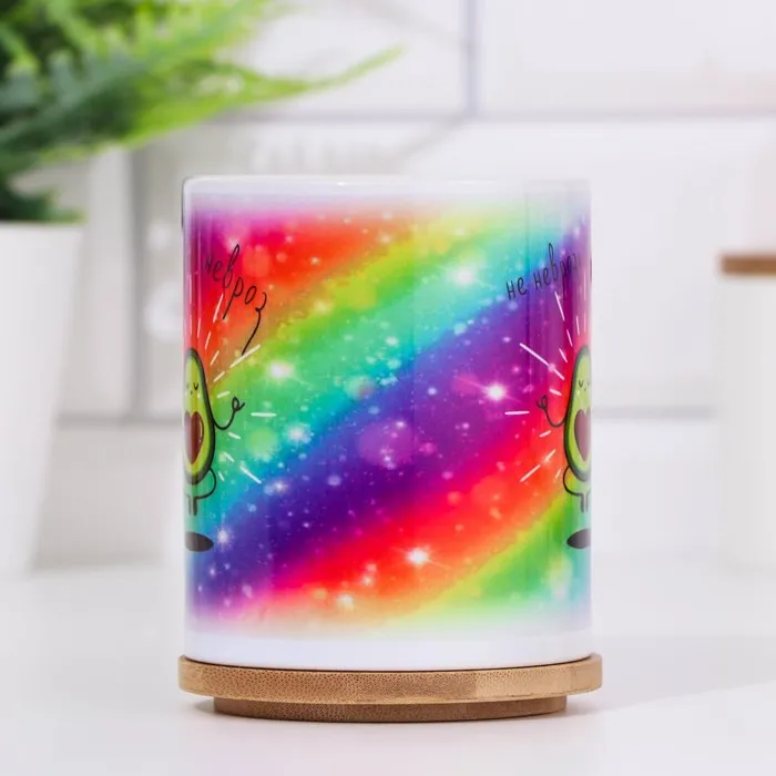 Кружка изготовлена из керамики. Рисунок нанесён методом сублимации, при котором краска проникает в верхний слой изделия, поэтому изображение получается стойким.