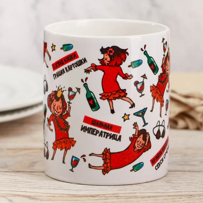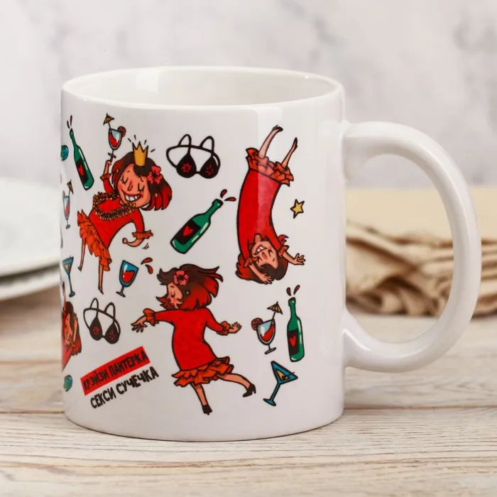 Кружка изготовлена из керамики. Рисунок нанесён методом сублимации, при котором краска проникает в верхний слой изделия, поэтому изображение получается стойким.
