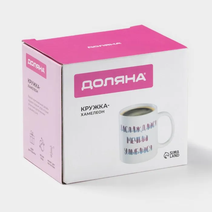 Кружка-хамелеон Доляна «Наслаждайся. Мечтай. Улыбайся» — не просто приспособление для питья. Это настоящее украшение дома и яркий аксессуар! Налейте горячего чаю, кофе или какао, и кружка сразу поменяет цвет. Вашу оригинальность по достоинству оценят гости, а сам сосуд освежит любой интерьер благодаря смелому дизайну.