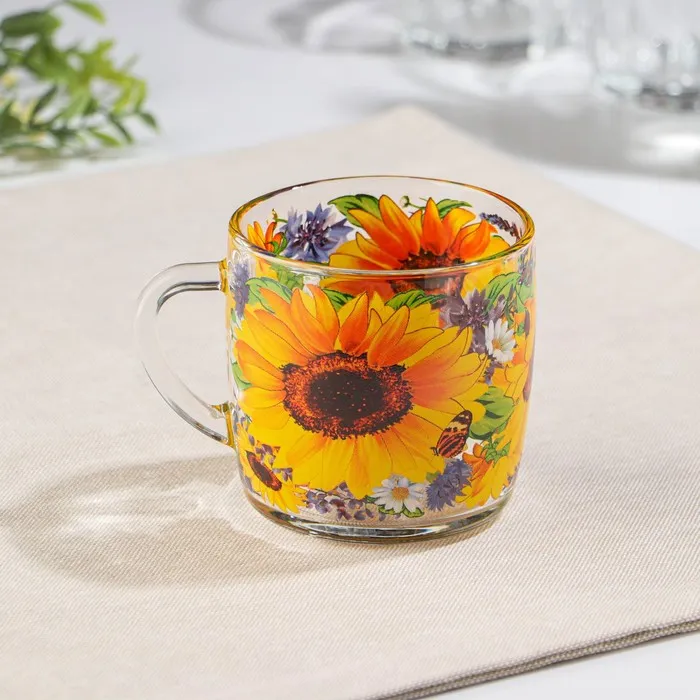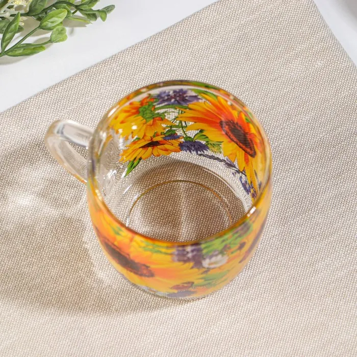 Стеклянная кружка «Подсолнух» – это красивый и нежный предмет декора, который привлекает внимание своей необычной красотой. Изготовлена из прочного и прозрачного стекла, которое позволяет наслаждаться напитком изнутри, а также любоваться на яркий подсолнух снаружи.